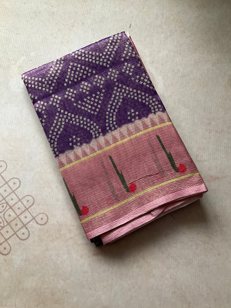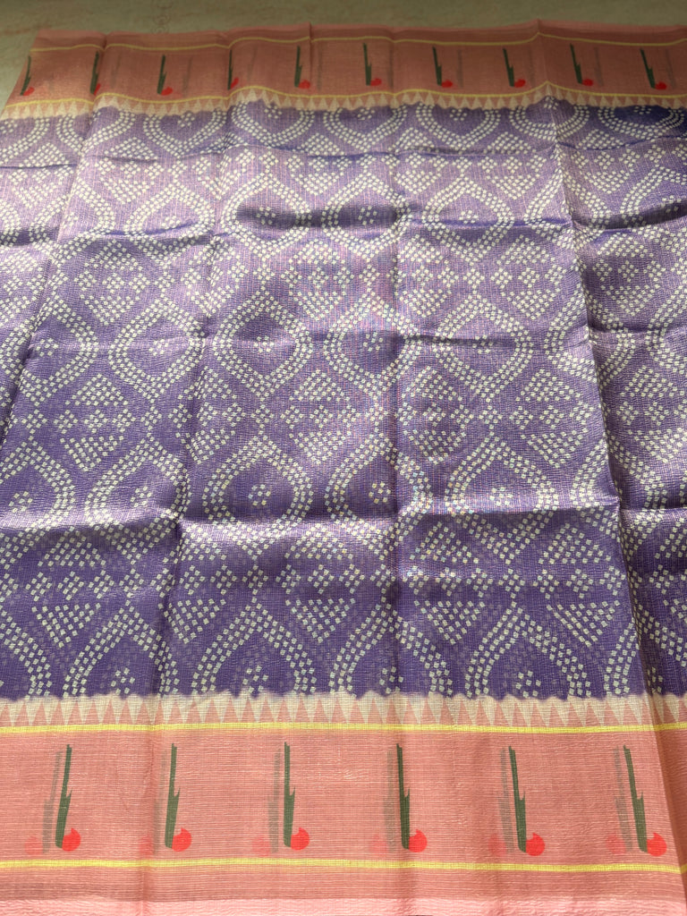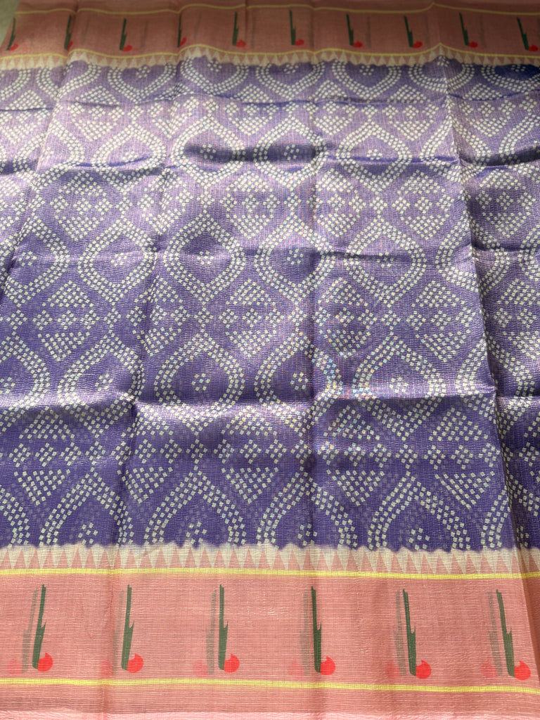 Step into timeless tradition with this stunning Semi Kota saree, crafted to blend the airy grace of Kota fabric with the rich heritage of Indian weaves. The saree features enchanting Bandhani prints that add a touch of vibrant artistry, creating a charming and youthful appeal.