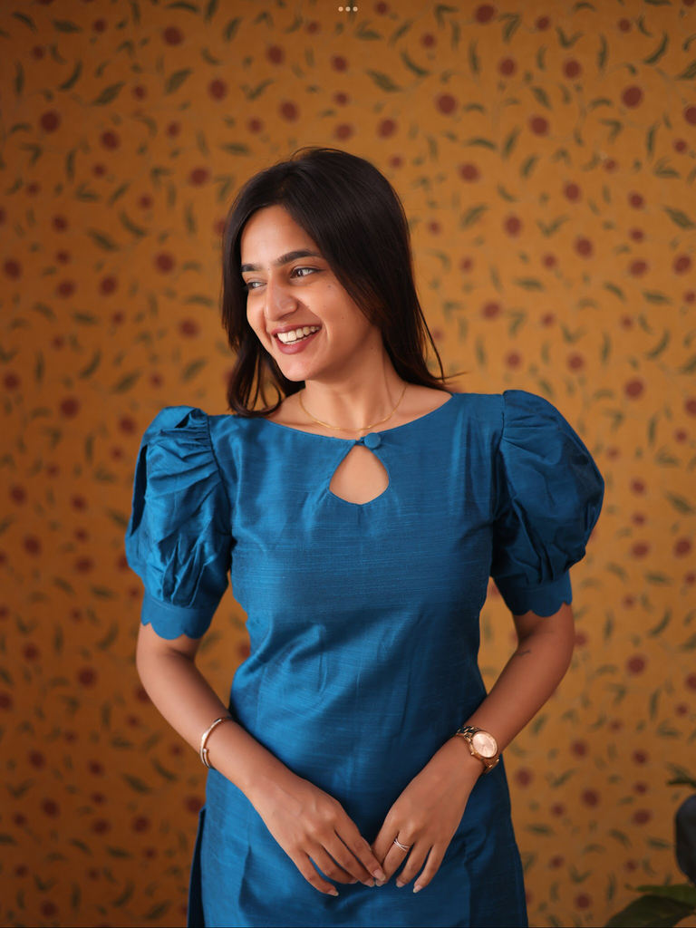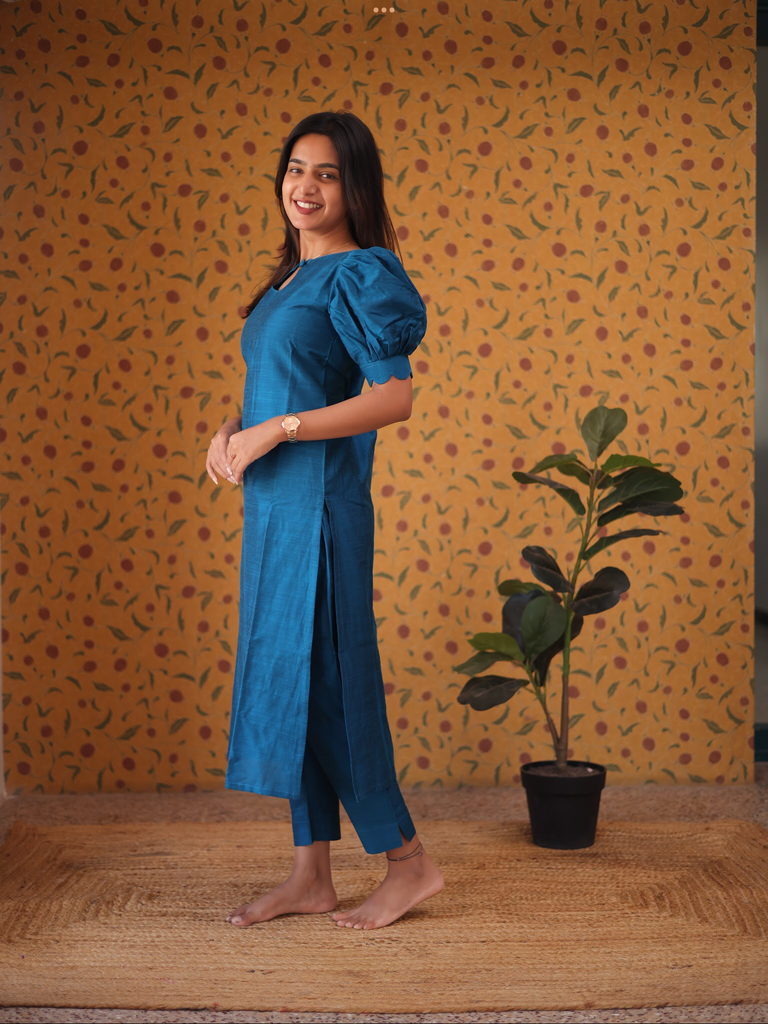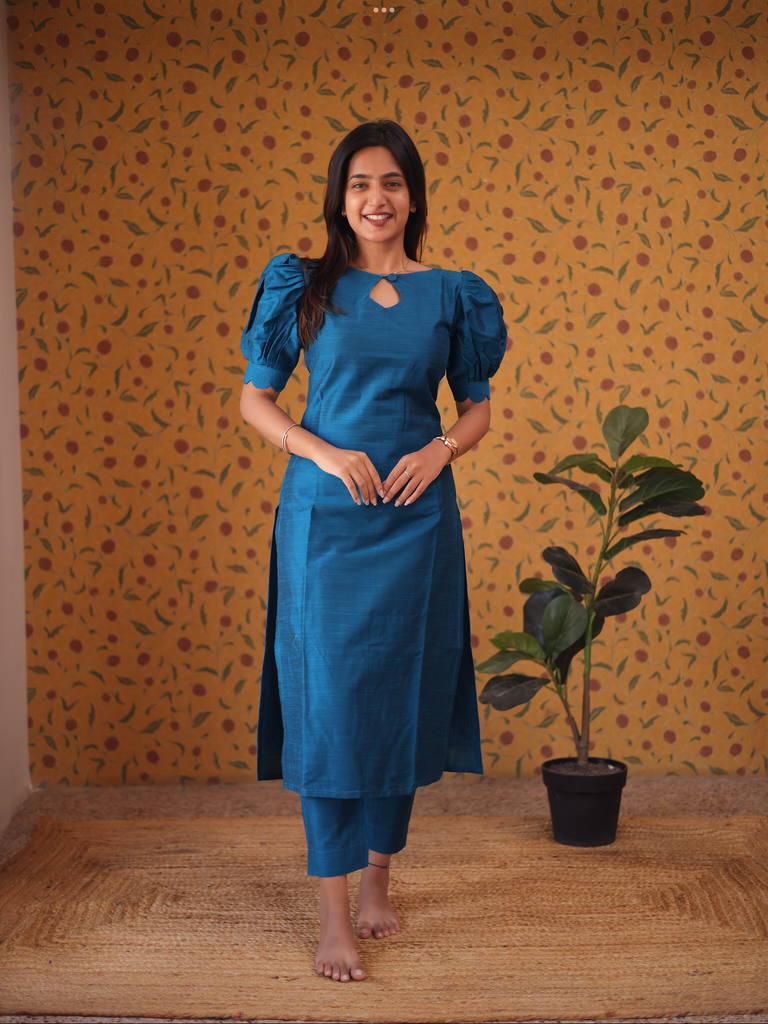Upgrade your wardrobe with the Siara kurta and pant set, designed to elevate your everyday style with comfort and versatility in mind. The set features a High neck with keyhole and Scalloped Puff sleeve, crafted with high-quality materials to ensure both fashion and function. As a must-have for any fashion-forward individual, the Siara set is perfect for formal and casual occasions alike.