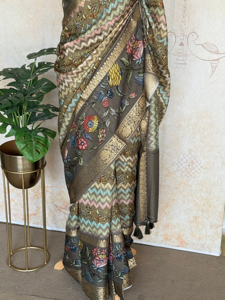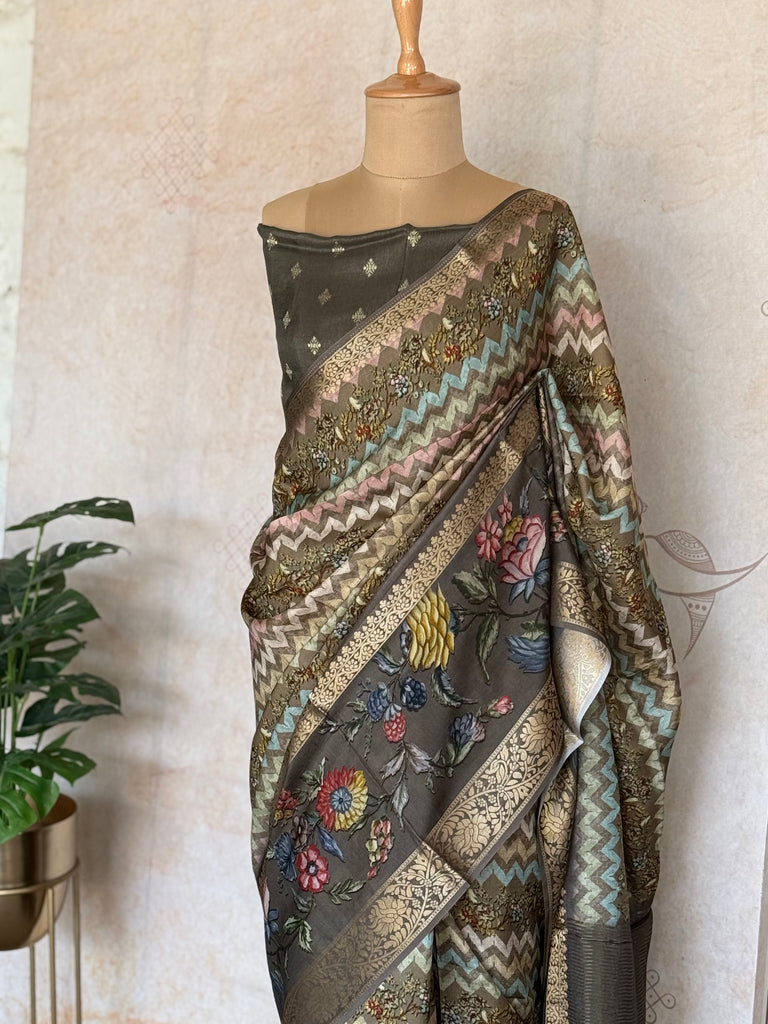 Rooted in artisanal elegance, this Dola Printed Silk Saree is a graceful blend of classic motifs and contemporary aesthetics. The saree features a rich charcoal grey base, adorned with intricate hand-inspired floral prints and rhythmic chevron patterns that add movement and visual depth to the drape.