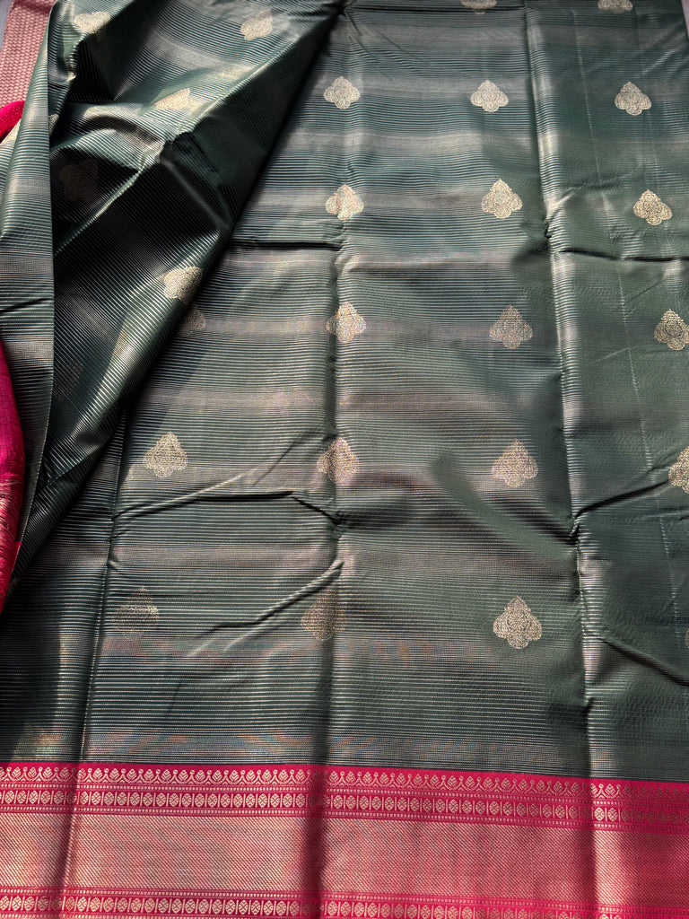 The saree features a striking green body adorned with subtle woven motifs and a red border, highlighted by intricate gold zari detailing. The contrasting hues create a regal yet refreshing look, ideal for festive occasions, weddings, or special celebrations.