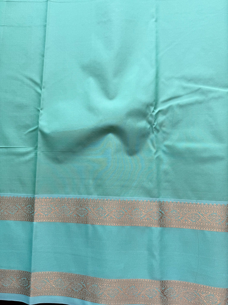 The saree features a striking pink body adorned with subtle woven motifs and a lustrous aqua blue border, highlighted by intricate gold zari detailing. The contrasting hues create a regal yet refreshing look, ideal for festive occasions, weddings, or special celebrations.