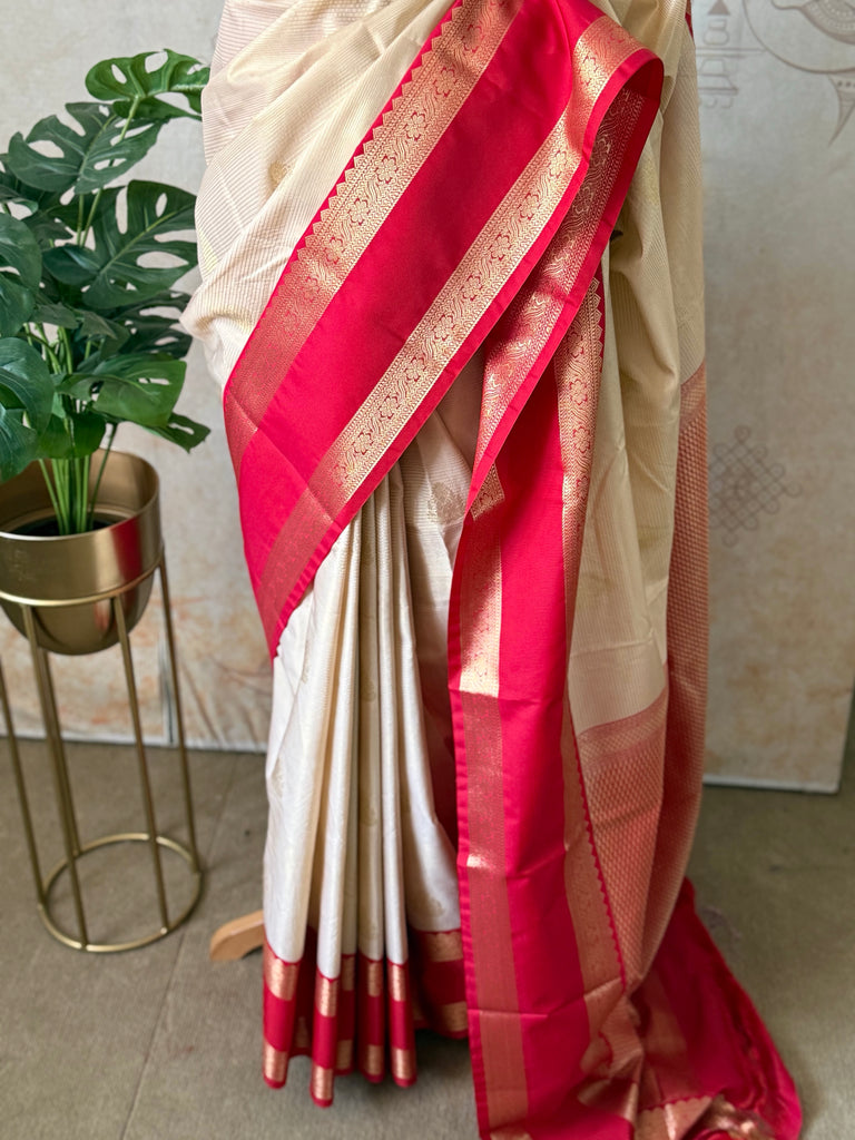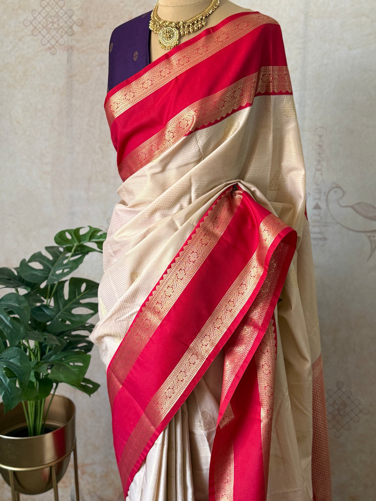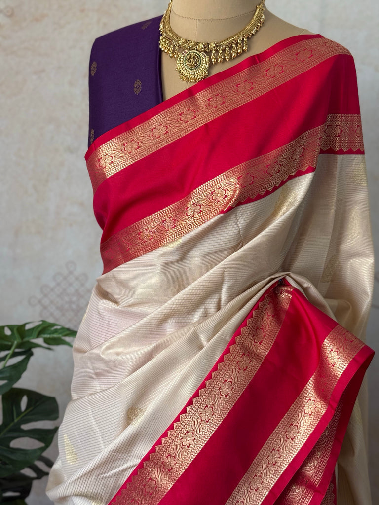 Enhancing its traditional appeal is a striking red Retta Petta (double) border, intricately woven with gold zari detailing, lending a bold contrast and classic Kanchi-inspired finish. The saree is completed with a complementing zari-woven pallu, making it an ideal choice for festive occasions and traditional celebrations.