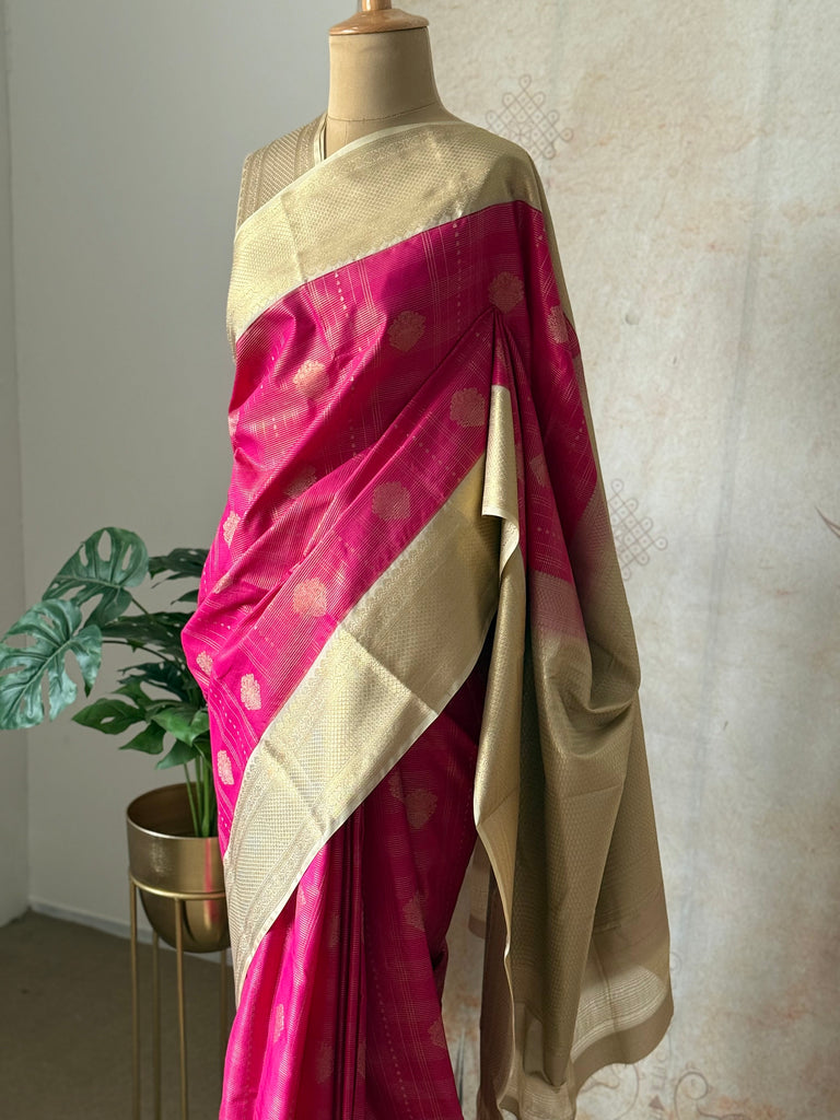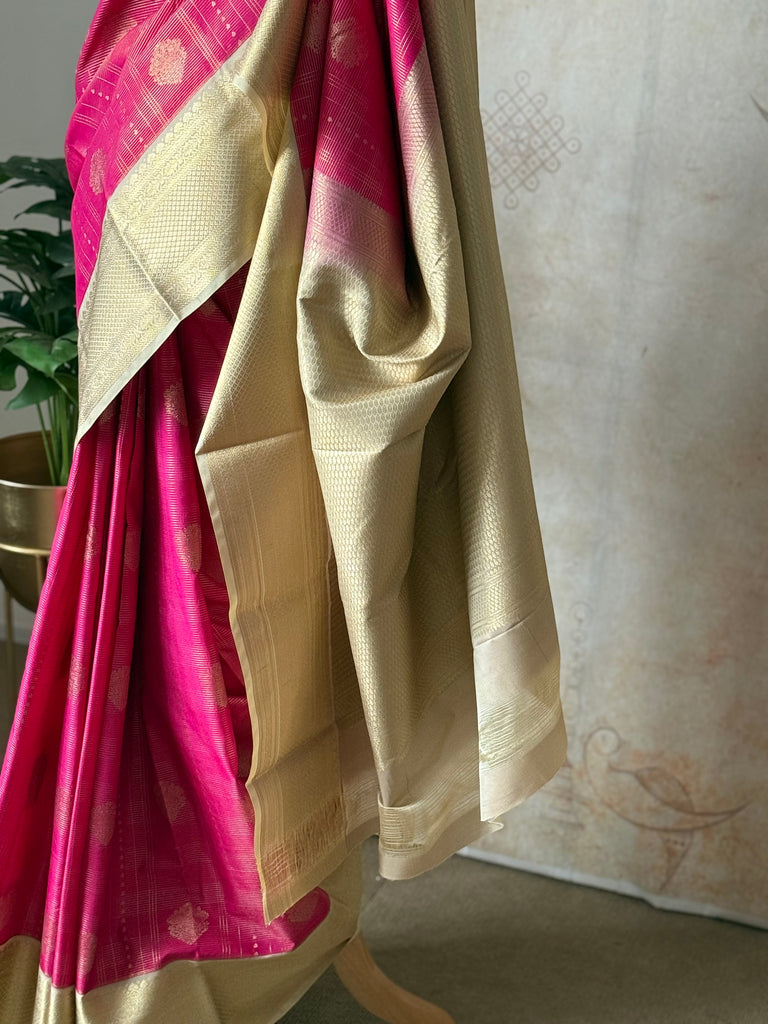 Bring festive charm to your wardrobe with this stunning Semi Kanchi Silk Saree, crafted to reflect timeless South Indian elegance. The saree features a rich Pink body, beautifully adorned with delicate golden zari buttas that add a subtle sparkle and refined grace.