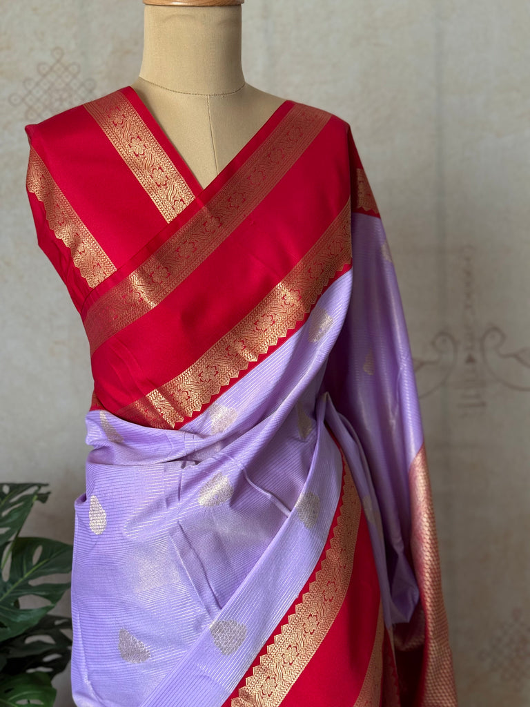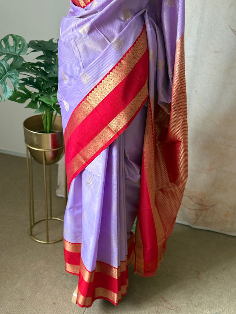 Bring festive charm to your wardrobe with this stunning Semi Kanchi Silk Saree, crafted to reflect timeless South Indian elegance. The saree features a rich Lavender body, beautifully adorned with delicate golden zari buttas that add a subtle sparkle and refined grace.