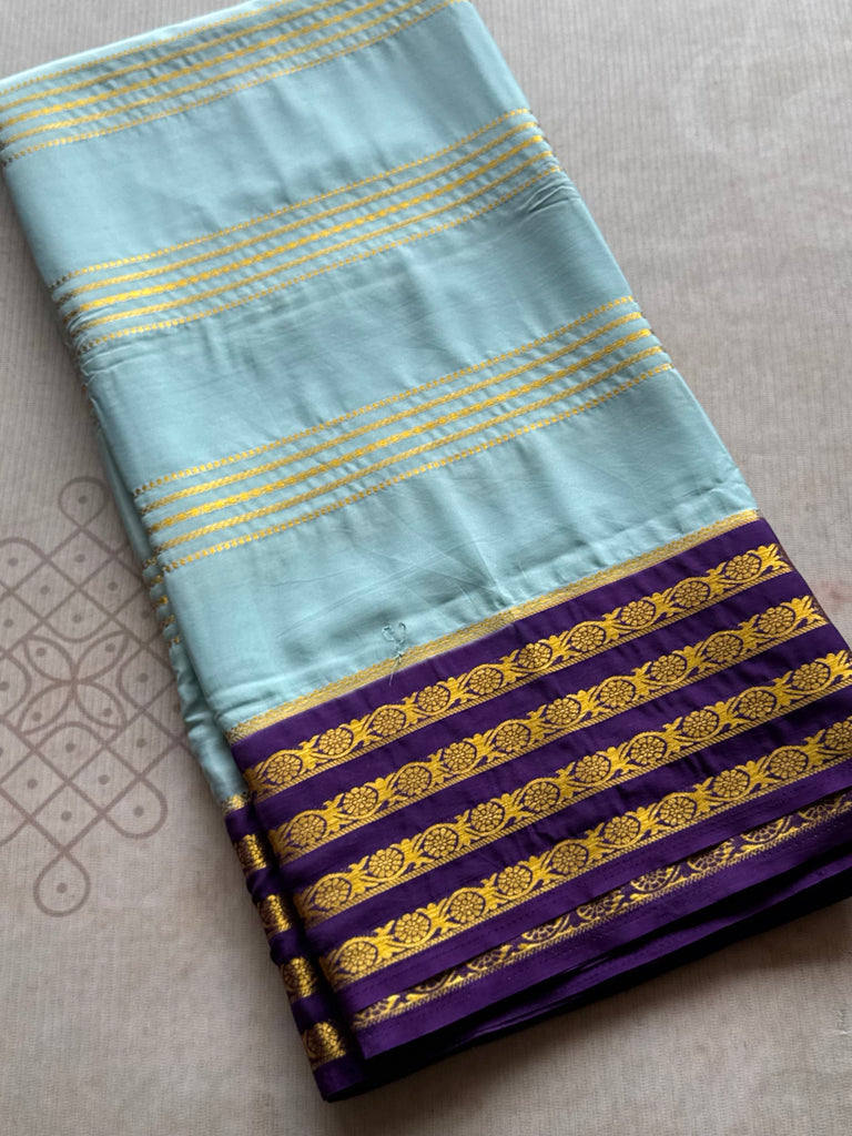 Elevate your ethnic wardrobe with this exquisitely crafted Semi Mysore Crepe Silk Saree, designed for timeless elegance and effortless grace. The saree showcases a soothing aqua blue body, enhanced with delicate golden zari stripes woven uniformly across the fabric, lending it a subtle yet luxurious sheen.