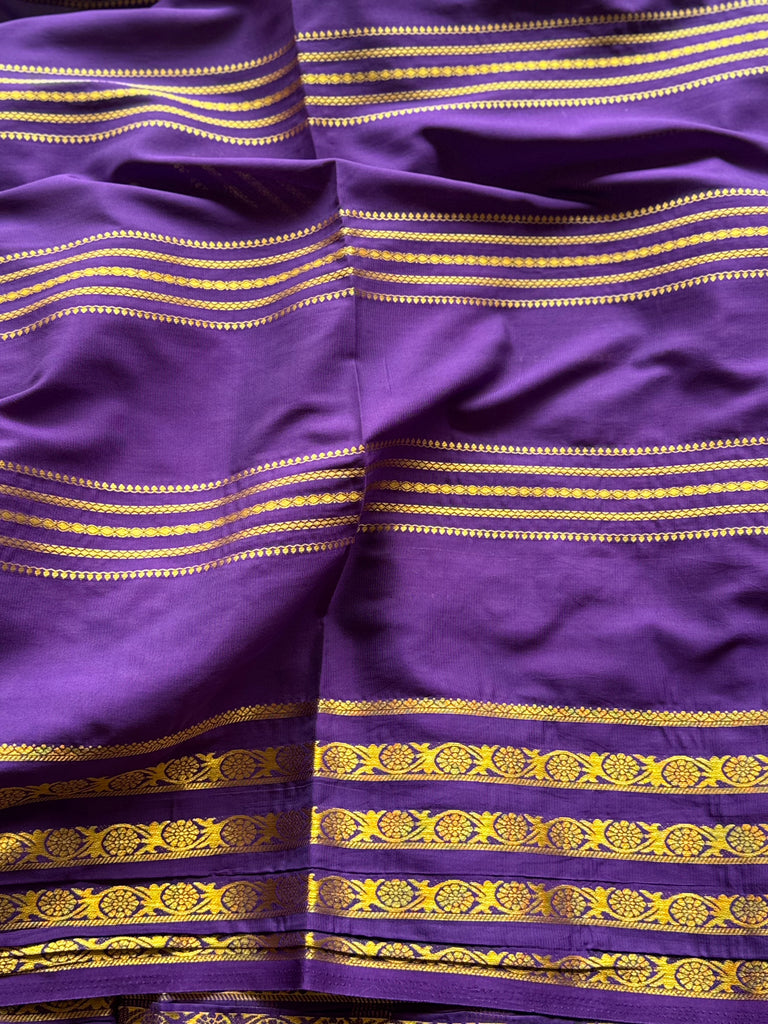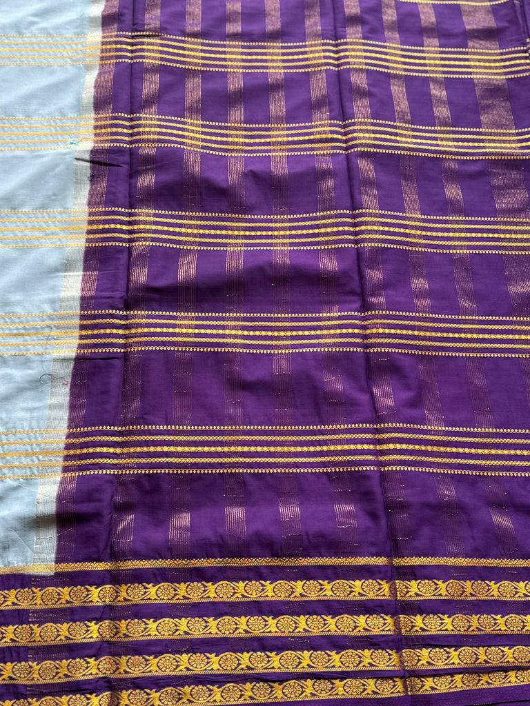 Accentuating the softness of the body is a bold royal purple contrast border and pallu, richly adorned with traditional gold zari floral motifs, adding depth, heritage charm, and visual richness. The saree is paired with a contrast blouse in the border color, completing a look that is both classic and contemporary.