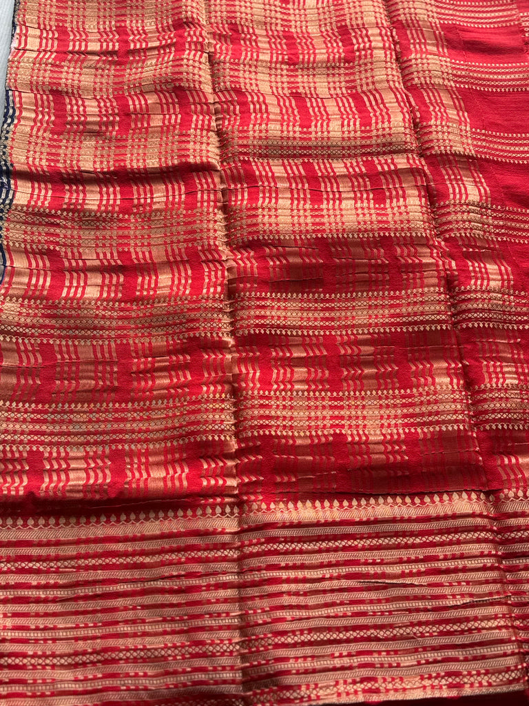 The saree is complemented by a bold vermilion red contrast border and pallu, intricately woven with traditional gold zari patterns that add richness and depth. A matching contrast blouse in the border color completes the ensemble, making it perfect for festive and ceremonial wear.