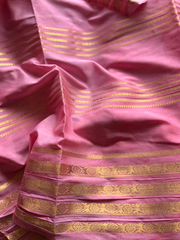 A beautifully coordinated soft pink contrast border and pallu, highlighted with gold zari detailing, elevate the overall look. The ensemble is completed with a contrast soft pink blouse, perfectly matched to the border for a harmonious and sophisticated finish.