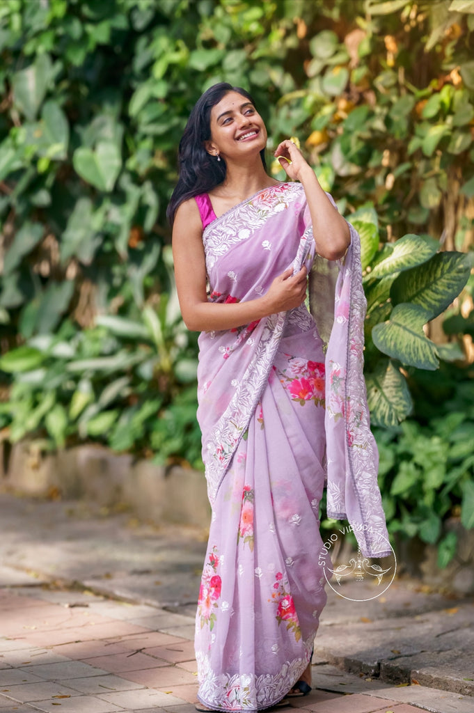 Classy and Elegant lavender Georgette saree with floral embroidery with thread overall the saree and in the Beautiful border depicting the elagance of the craftmanship!