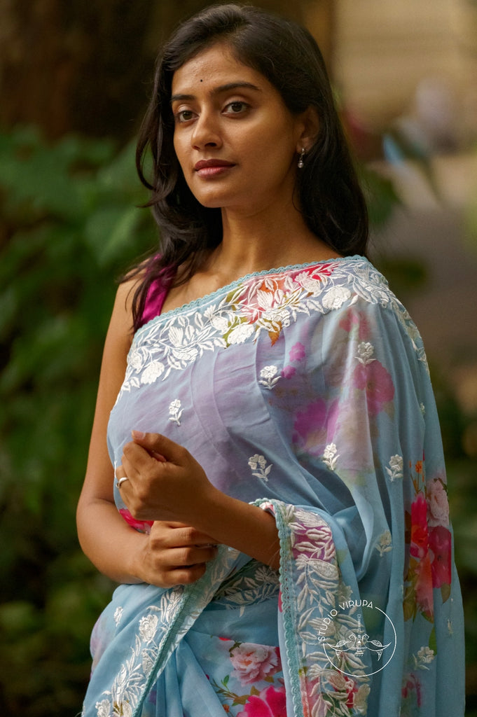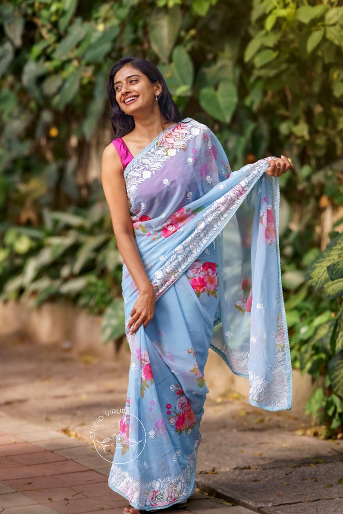 Classy and Elegant blue Georgette saree with floral embroidery with thread overall the saree and in the Beautiful border depicting the elagance of the craftmanship!