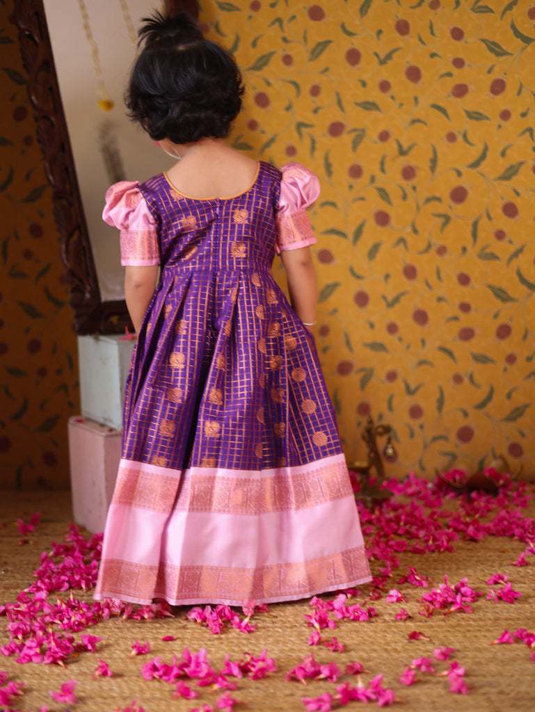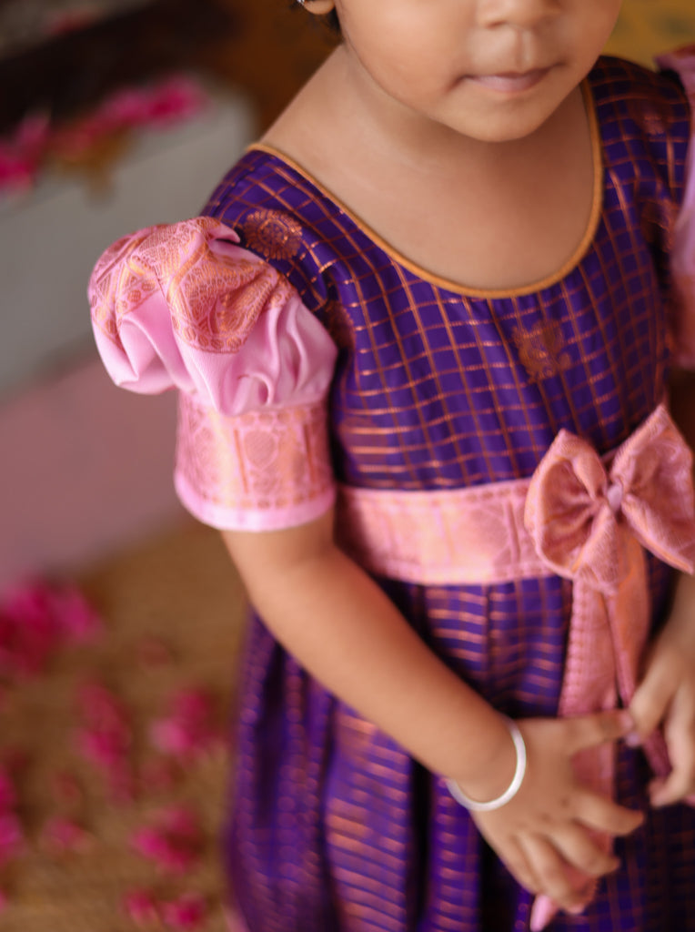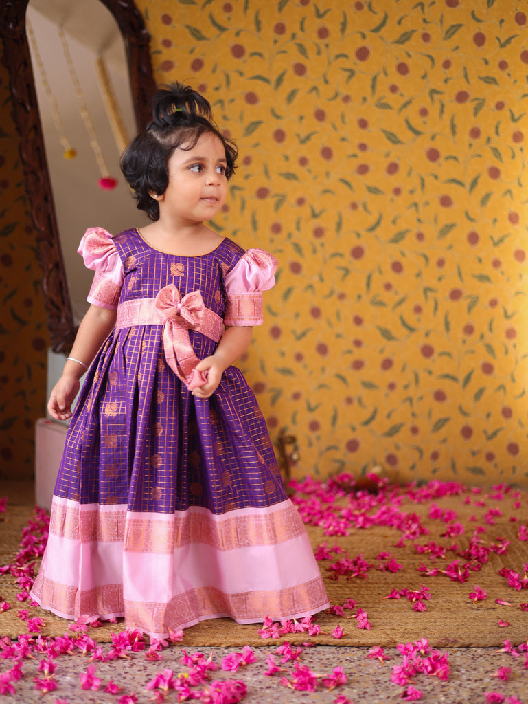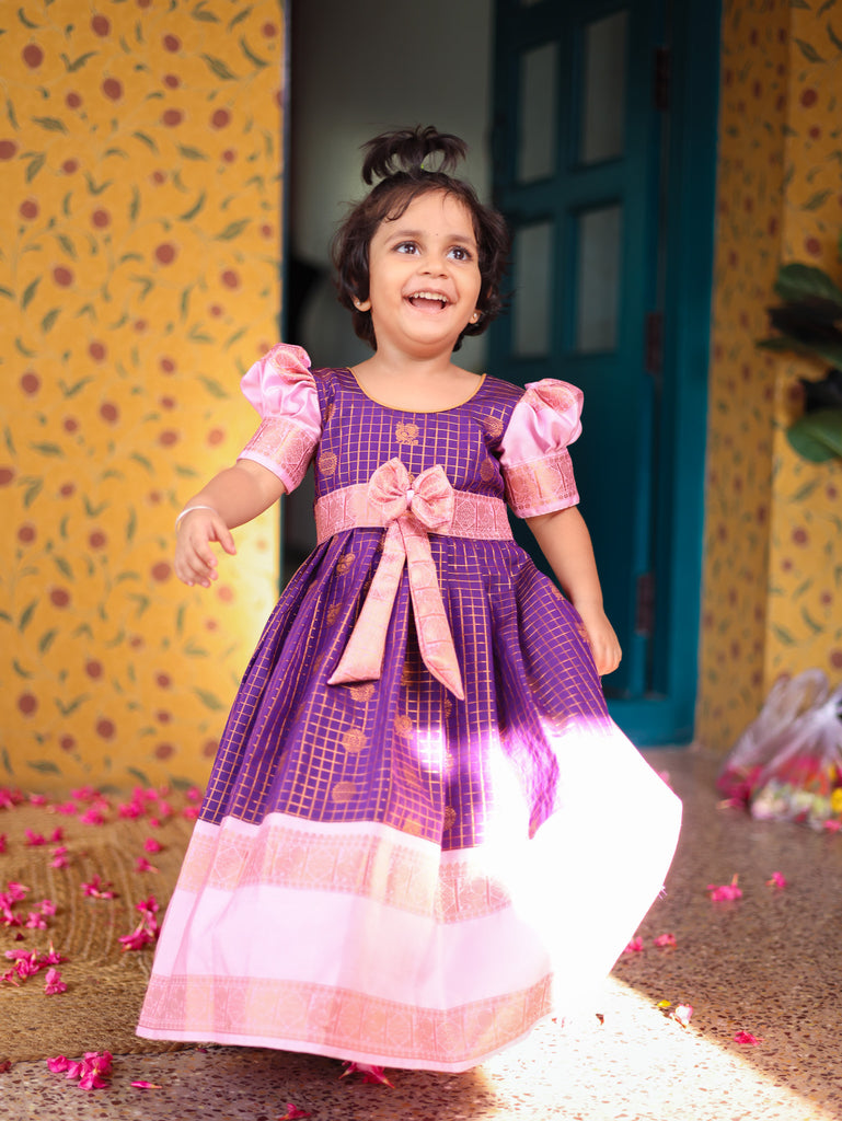 Indulge in luxury with the Mini Pattu Kids Frock. Perfect for festivals and events, its exquisite design exudes a classy and sophisticated aura. Elevate your wardrobe with this opulent frock.