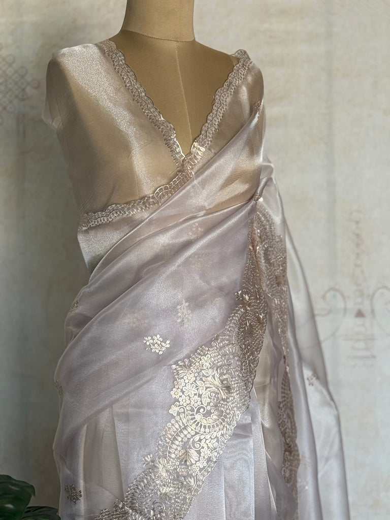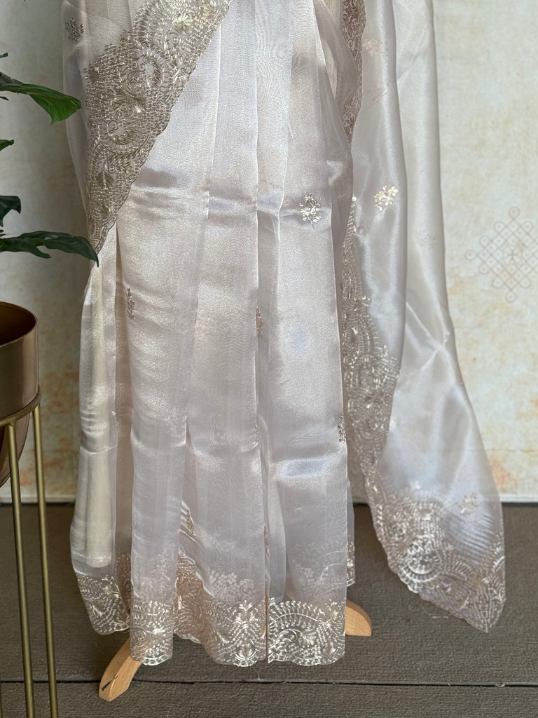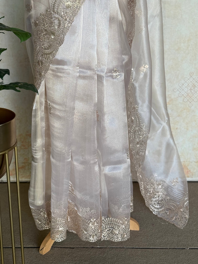 Paired with the saree is a matching blouse piece featuring coordinated pita work embroidery on the border, allowing for a perfectly styled and cohesive look. The lightweight organza fabric offers a graceful fall, while the scalloped edges enhance its feminine charm. The body features minimal, scattered motifs that balance elegance with sophistication, making it ideal for those who appreciate understated luxury.
