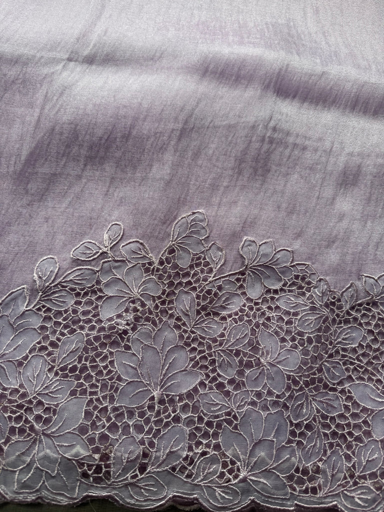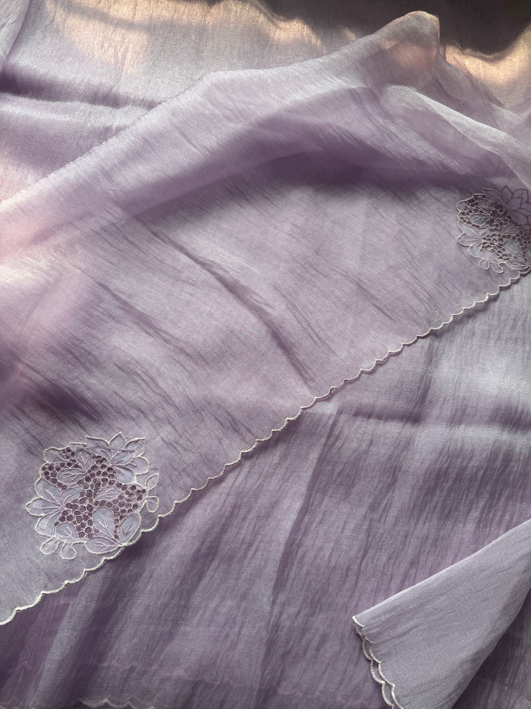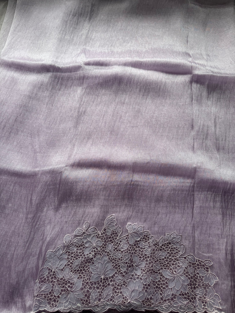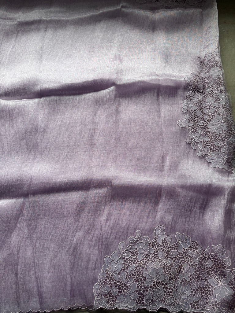 This elegant Lilac Oraganza saree exudes sophistication with its subtle shimmer and graceful drape. Crafted from fine organza, the saree beautifully reflects light, creating a soft, radiant glow with every movement. The highlight of this masterpiece lies in its exquisite floral cutwork embroidery, meticulously handcrafted along the borders and pallu. Each floral motif features delicate petal-shaped cutouts outlined with fine threadwork, forming intricate lace-like patterns that add dimension and texture to the sheer organza base.