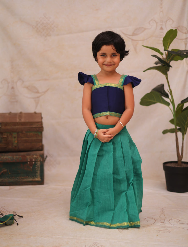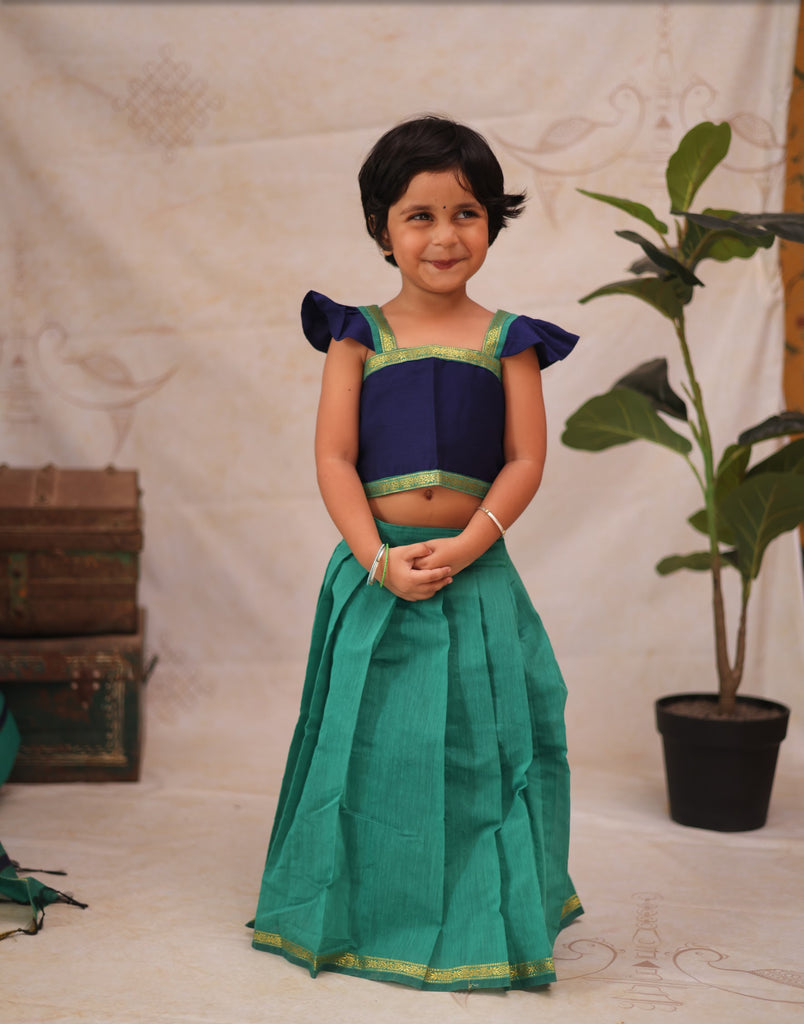 Elevate your child's style with the Aakriti crop top and skirt set. Crafted from luxurious semi-silk, the ensemble features captivating sequin embellishments for a touch of sophistication and glamour. Ideal for any event, this set offers both comfort and fashion for your little one.