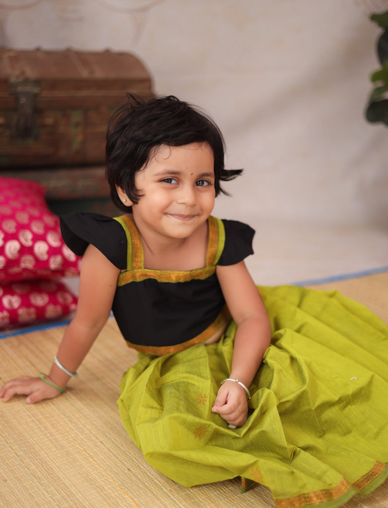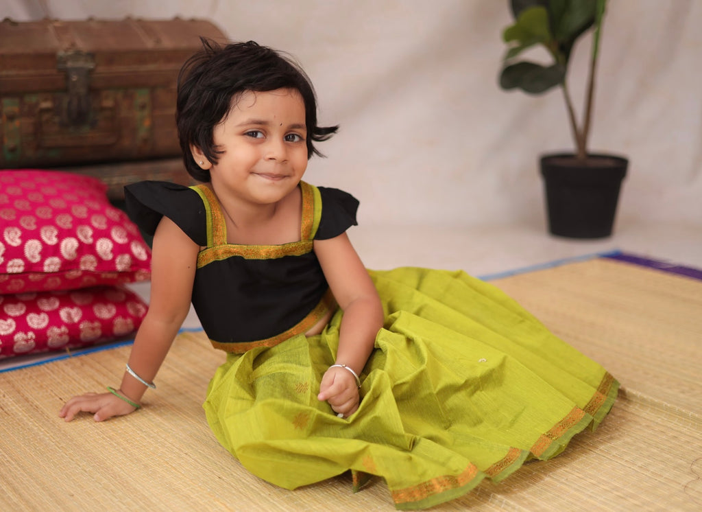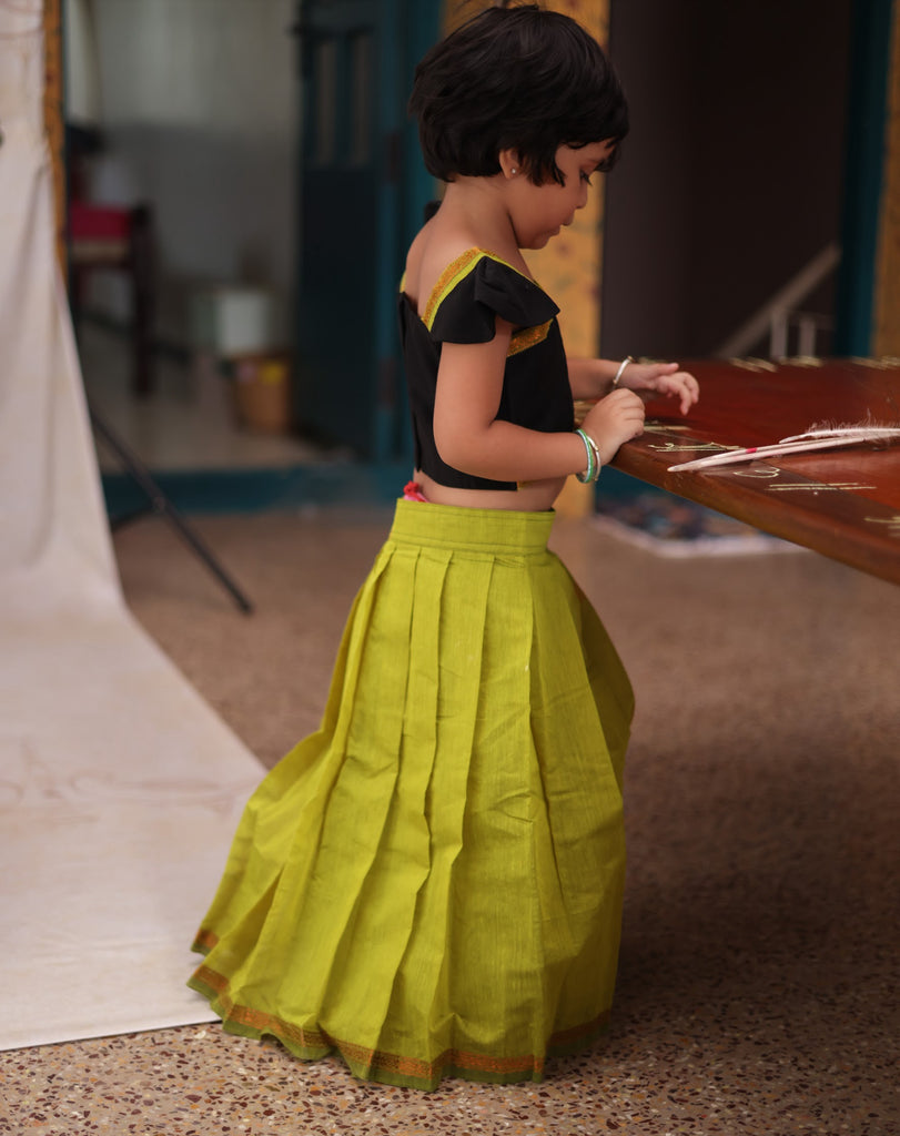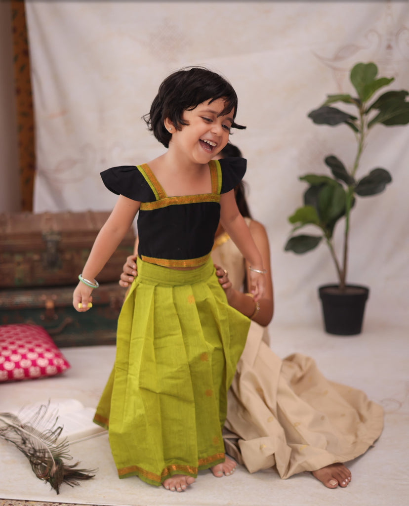 Elevate your child's style with the Aakriti crop top and skirt set. Crafted from luxurious semi-silk, the ensemble features captivating sequin embellishments for a touch of sophistication and glamour. Ideal for any event, this set offers both comfort and fashion for your little one.