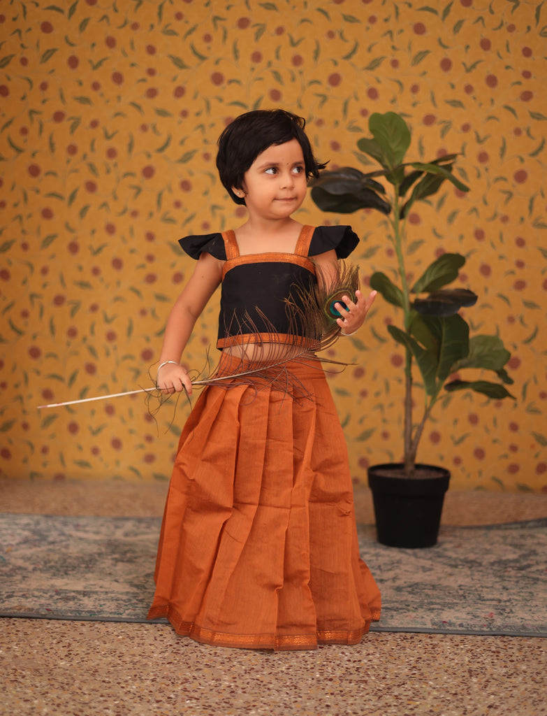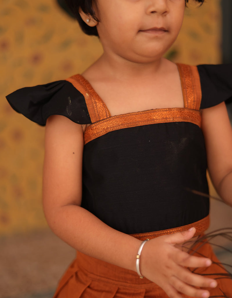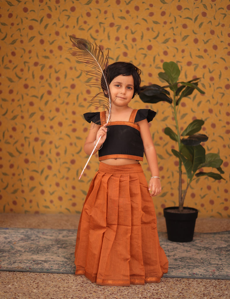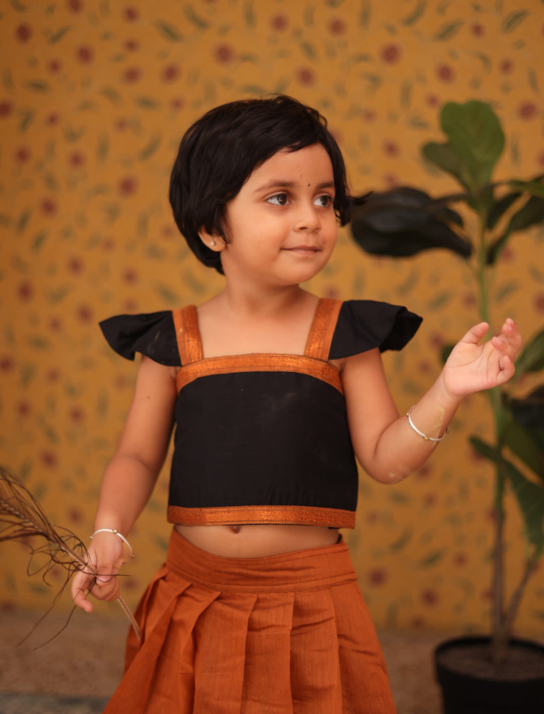 Elevate your child's style with the Aakriti crop top and skirt set. Crafted from luxurious semi-silk, the ensemble features captivating sequin embellishments for a touch of sophistication and glamour. Ideal for any event, this set offers both comfort and fashion for your little one.