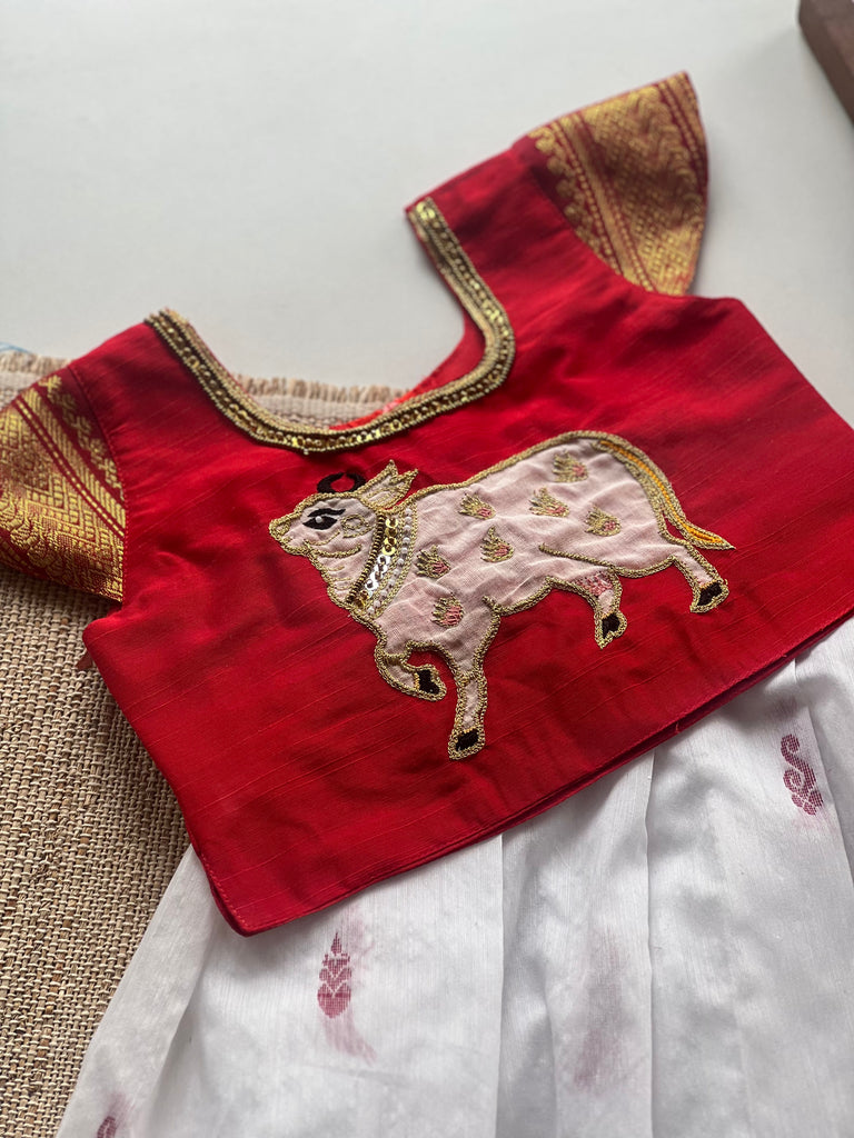 Beautiful kids crop top and skirt in semi silk top with hand embroidery and Chettinad Cotton bottom , so apt for this hot summer.