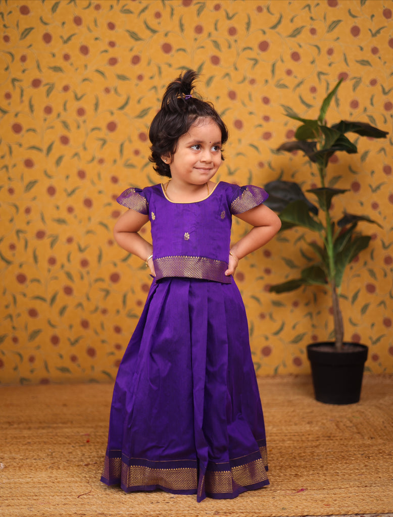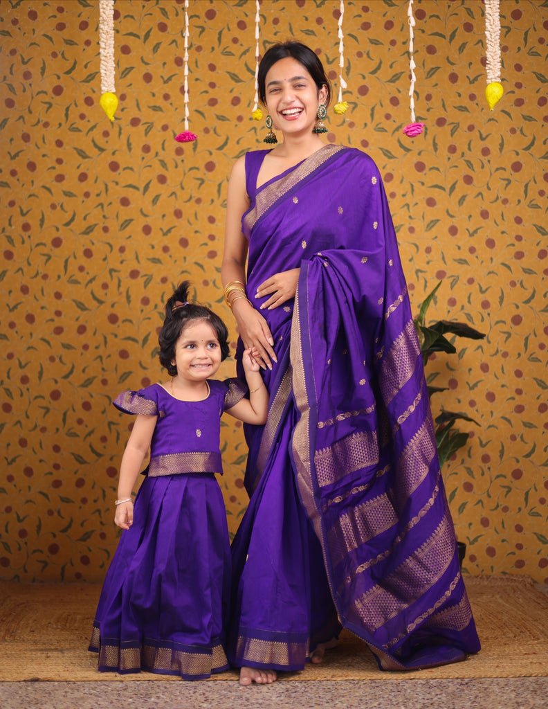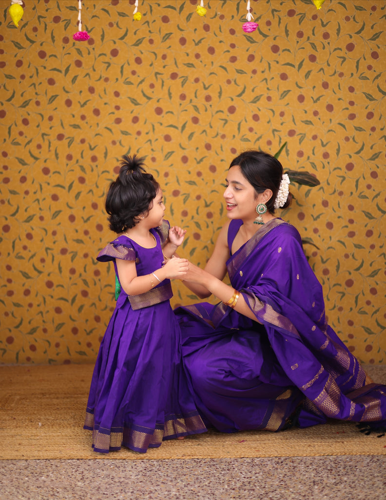 Indulge in the luxury of the Aakriti Mom & Daughter set. Made with Semi Kanchi Silk, this vibrant saree and matching Kids Crop Top & Skirt embody the celebration of love between mother and daughter. Perfect for any festival, feel the bond of love as you and your little one wear Virupa's Aakriti Collection.