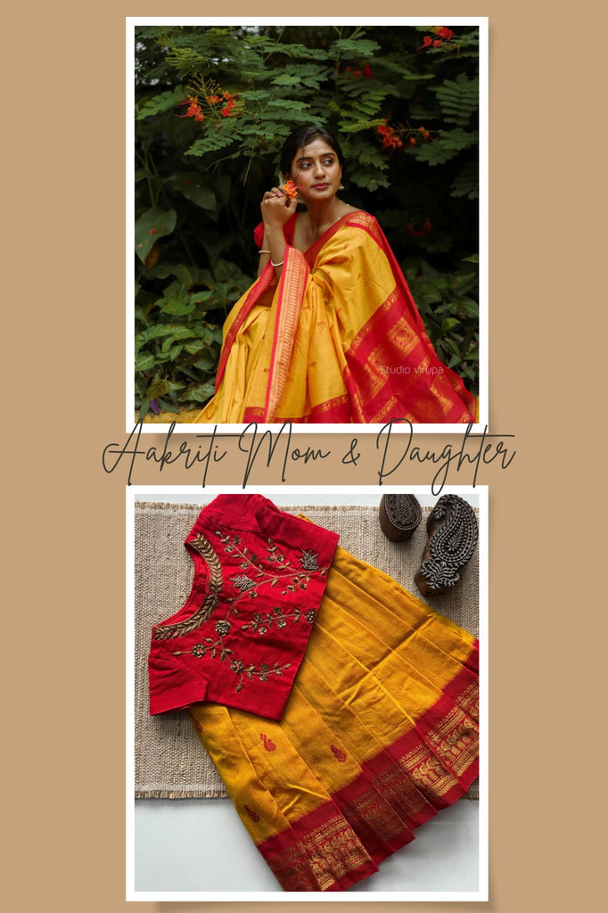 Indulge in the luxury of the Aakriti Mom & Daughter set. This vibrant saree and matching Kids Crop Top & Skirt embody the celebration of love between mother and daughter. Perfect for any festival, feel the bond of love as you and your little one wear Virupa's Aakriti collection.