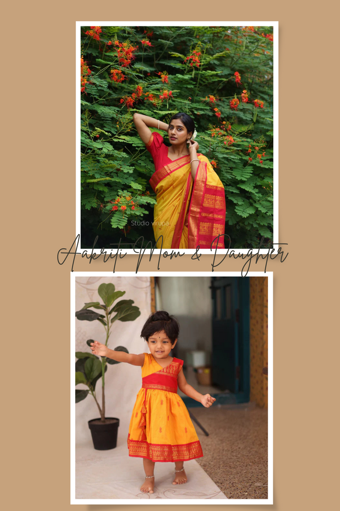 Indulge in the luxury of the Aakriti Mom & Daughter set. This vibrant saree and matching Kids Dress embody the celebration of love between mother and daughter. Perfect for any festival, feel the bond of love as you and your little one wear Virupa's Aakriti collection.