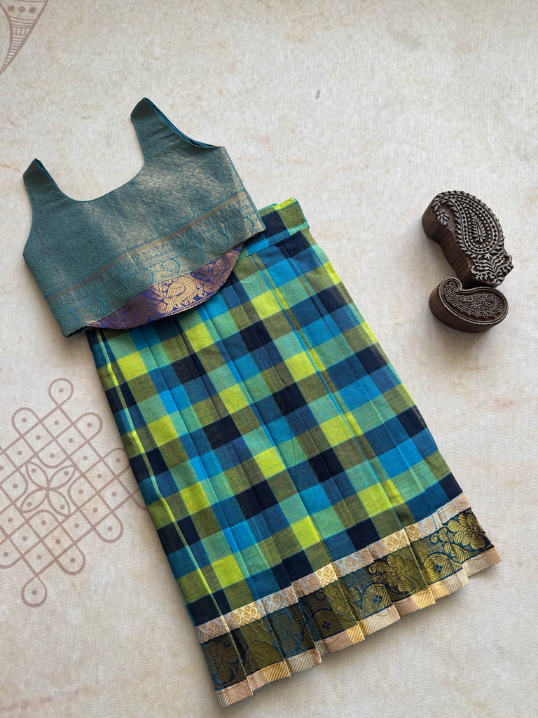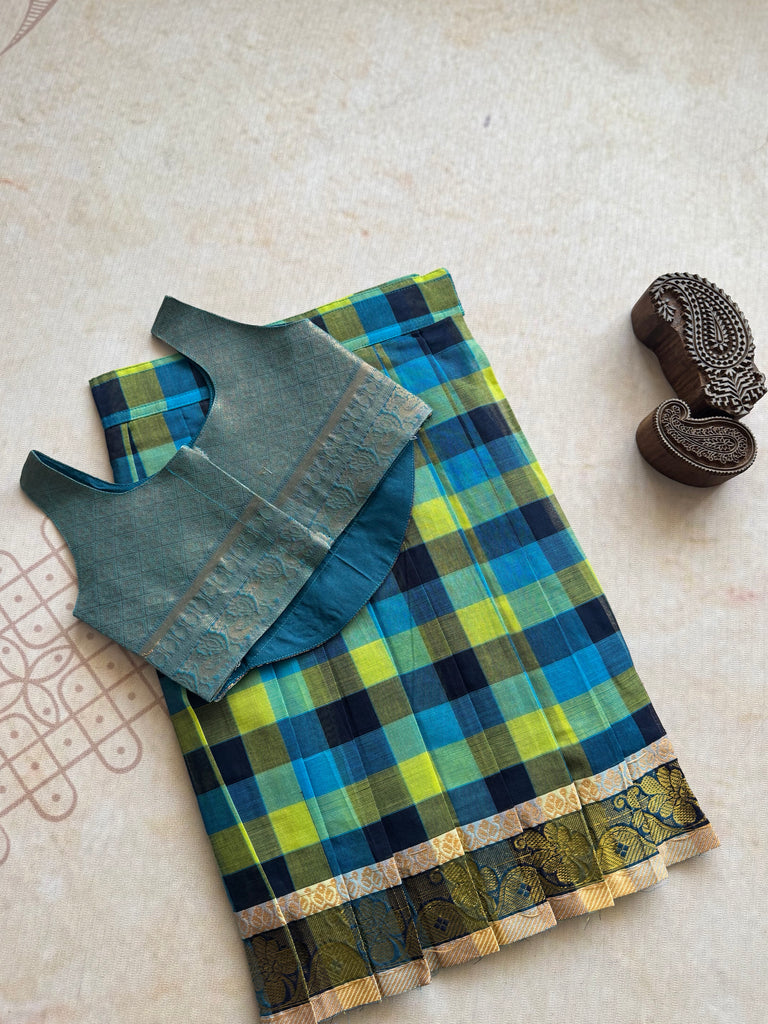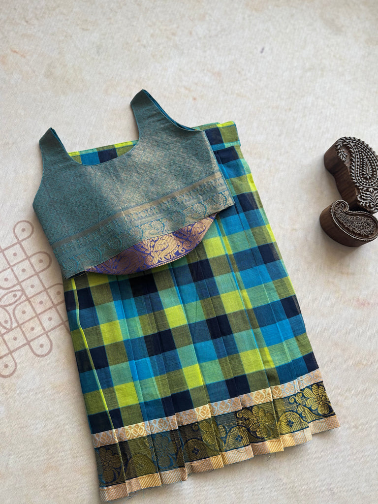 Introducing Virupa's exclusive Diwali collection, featuring a beautifully tailored crop top and checkered Chettinad cotton skirt for kids. Made with high-quality cotton material, this festive ensemble offers both style and comfort for your little one. Elevate their wardrobe with this must-have for the holiday season.