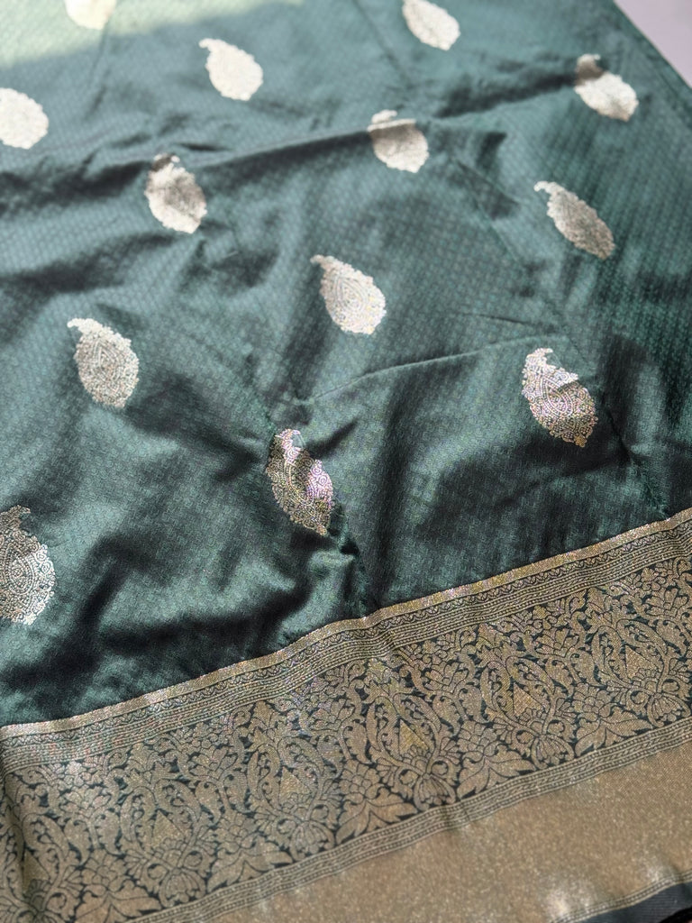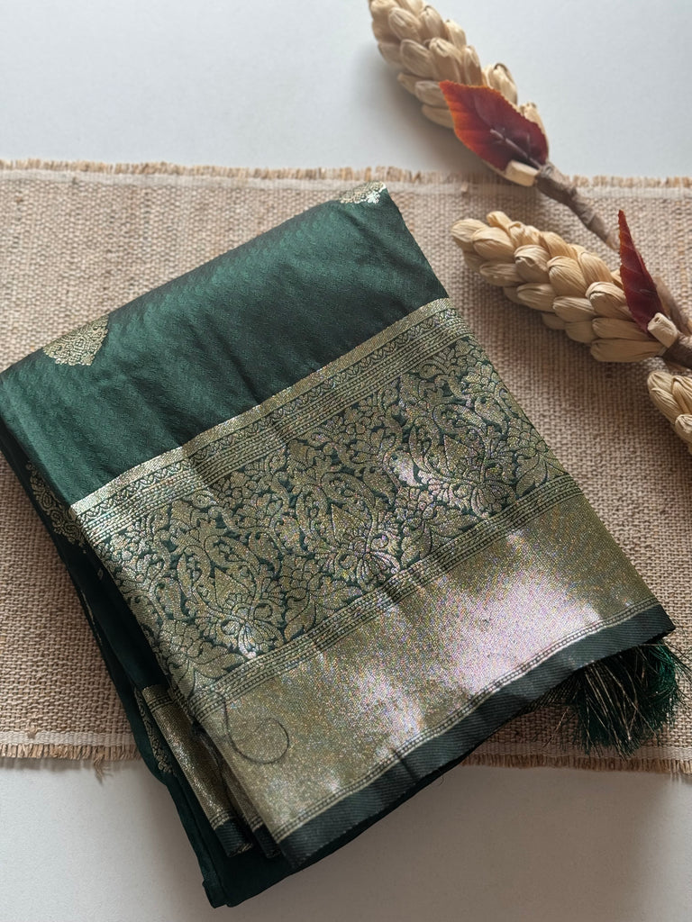 Elevate your style with Vibha, a stunning Banarasi silk saree adorned with intricate zari buttas and a detailed border. Exude elegance and grace with this traditional yet luxurious piece, perfect for any occasion. Experience the beauty and benefits of fine craftsmanship and quality materials with Vibha.