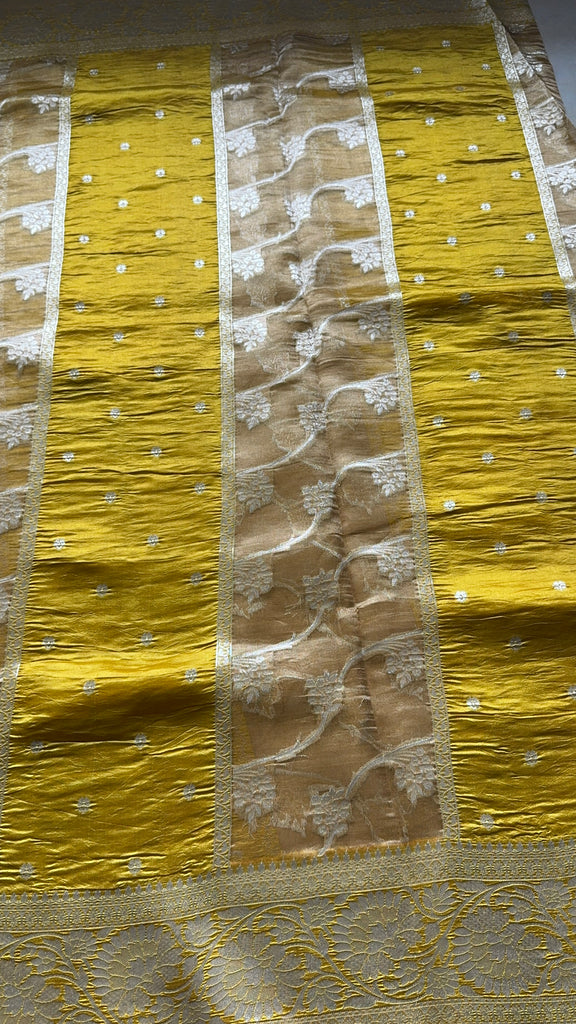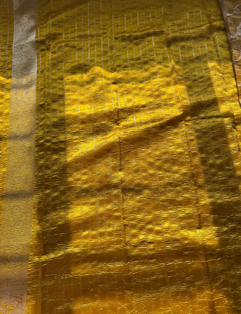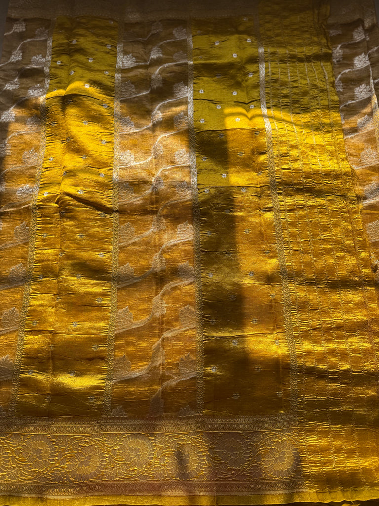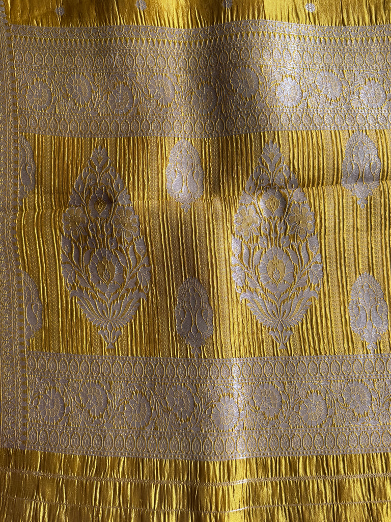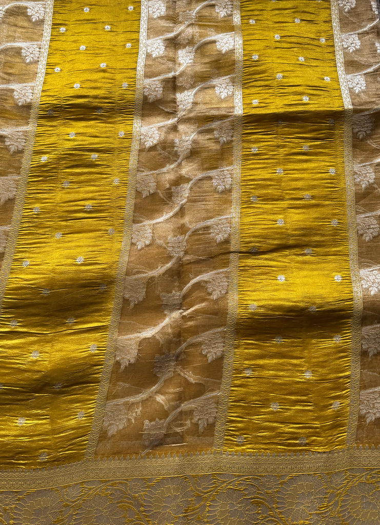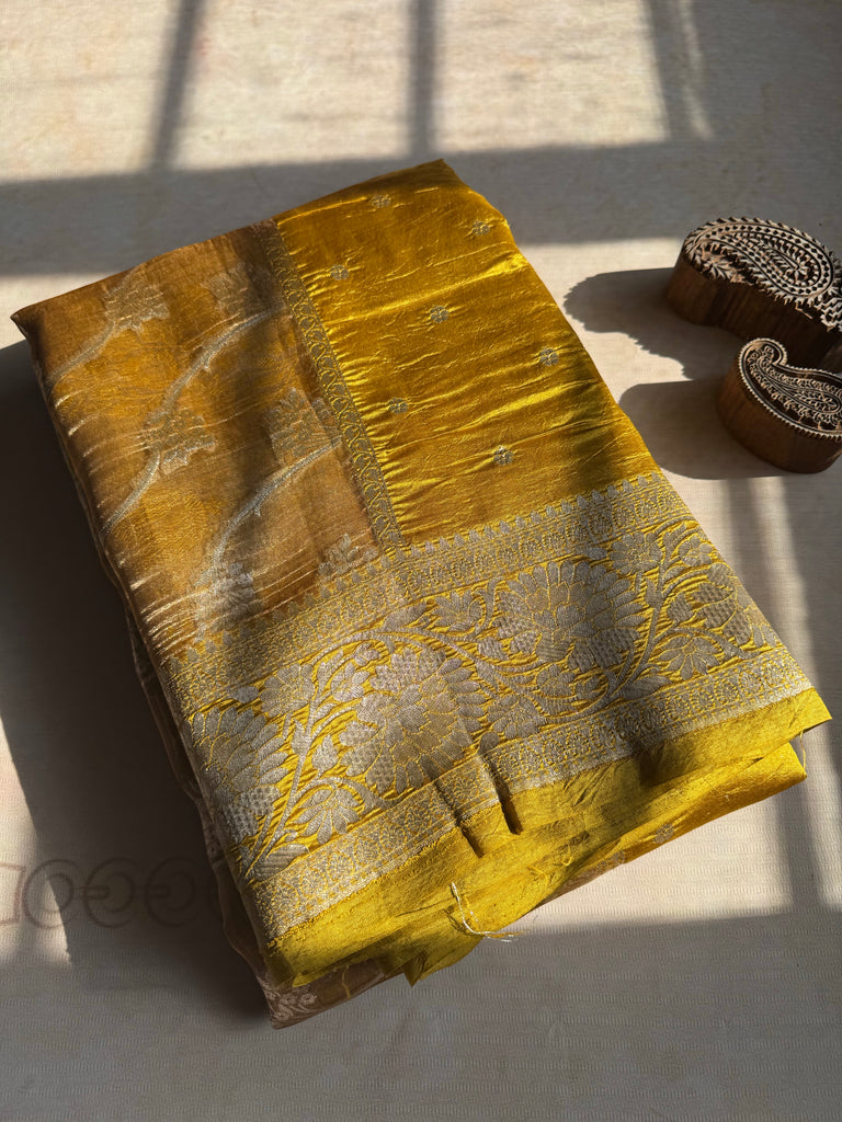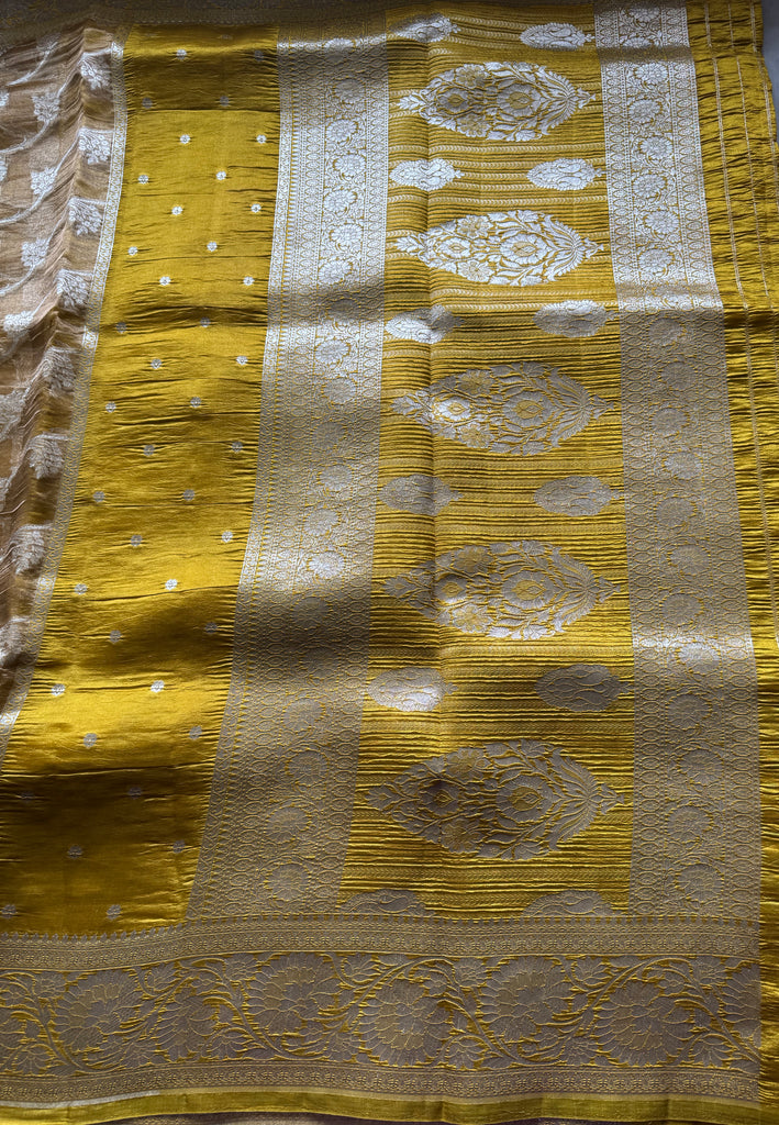 Step into refined elegance with this Banarasi pure mango silk saree, designed in a unique rangkat pattern over luxurious crush tissue. The rich mustard hue radiates warmth, making it a perfect choice for festive events, cultural celebrations, and grand occasions.