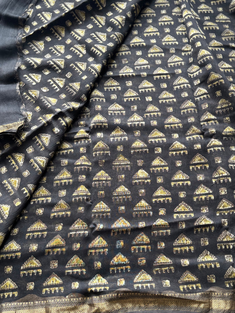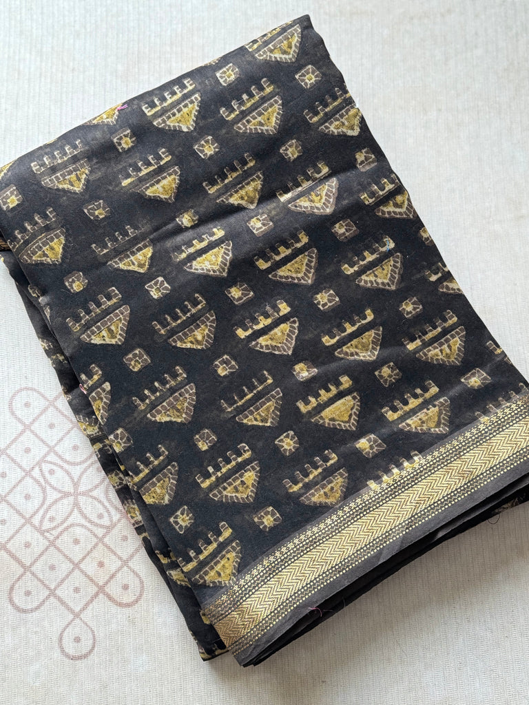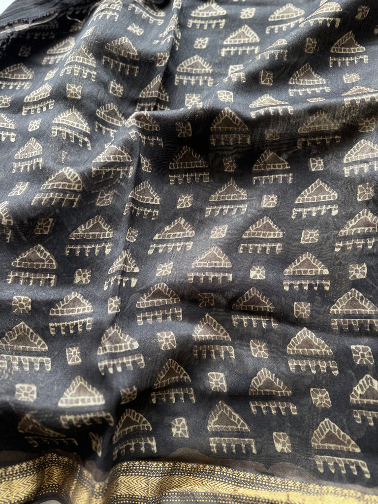 Experience the timeless elegance of our exquisite Chandheri Saree, adorned with delicate Jhumka motifs that bloom gracefully across the entire body. The saree is framed with rich golden Nizam borders, adding a regal charm and traditional opulence to its silhouette.