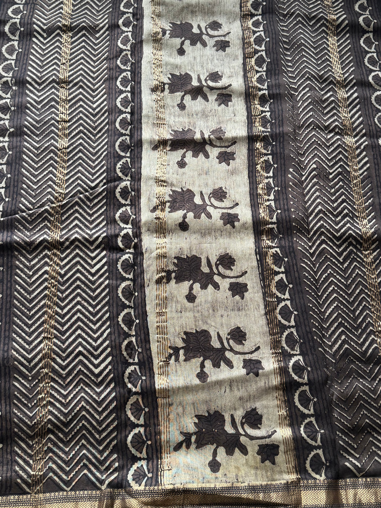 The pallu flows beautifully with intricate floral artistry, complemented by subtle golden zari lines that enhance its drape with a soft, luminous sheen, perfectly balancing tradition with contemporary finesse.