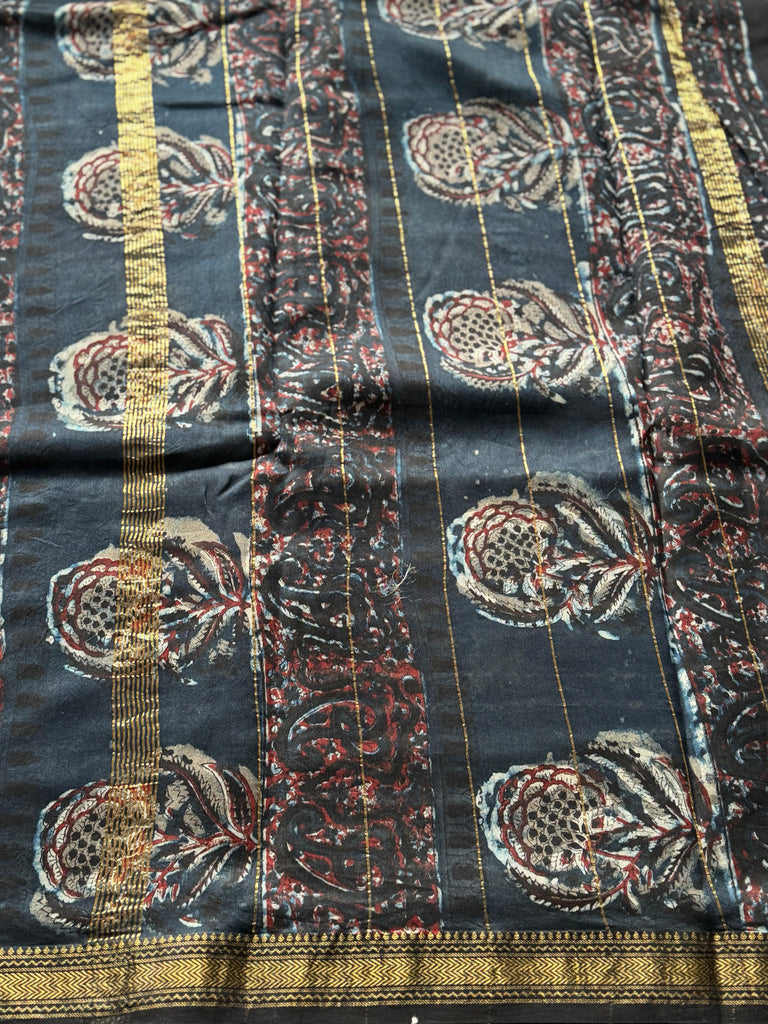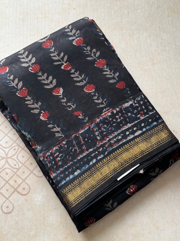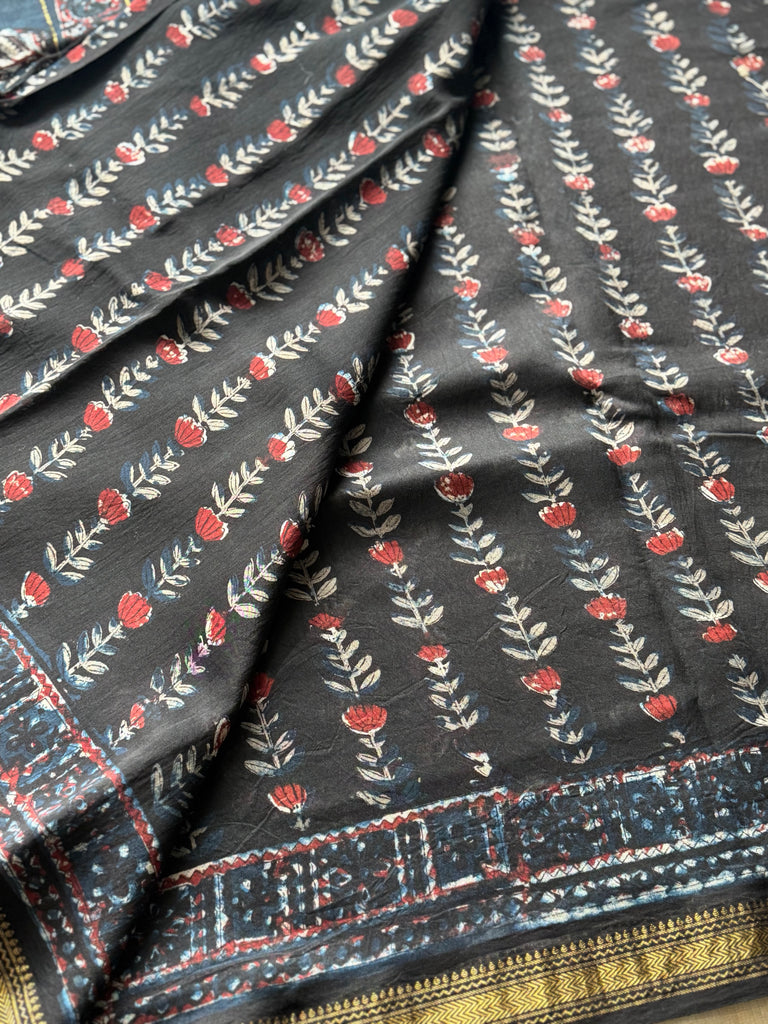 Experience the timeless elegance of our exquisite Chandheri Saree, adorned with delicate floral motifs that bloom gracefully across the entire body. The saree is framed with rich golden Nizam borders, adding a regal charm and traditional opulence to its silhouette.