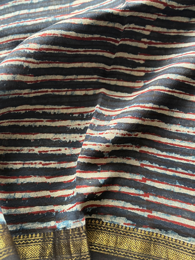 The pallu flows beautifully with intricate floral artistry, complemented by subtle golden zari lines that enhance its drape with a soft, luminous sheen. Completing the ensemble is a contrasting blouse featuring contrasting horizontal lines, finished with an elegant Nizam border—perfectly balancing tradition with contemporary finesse.