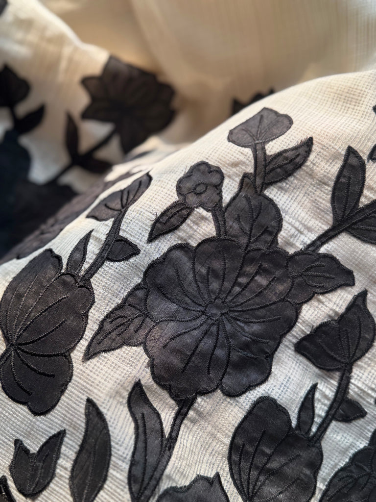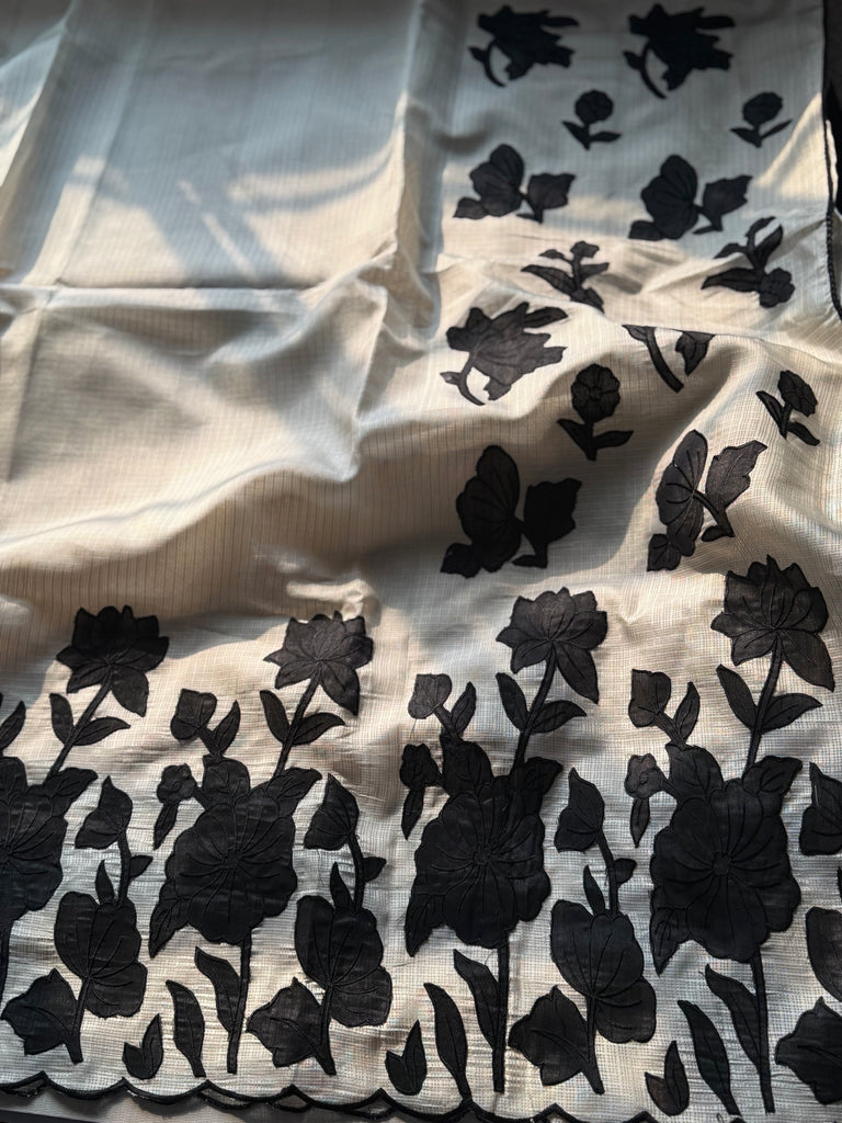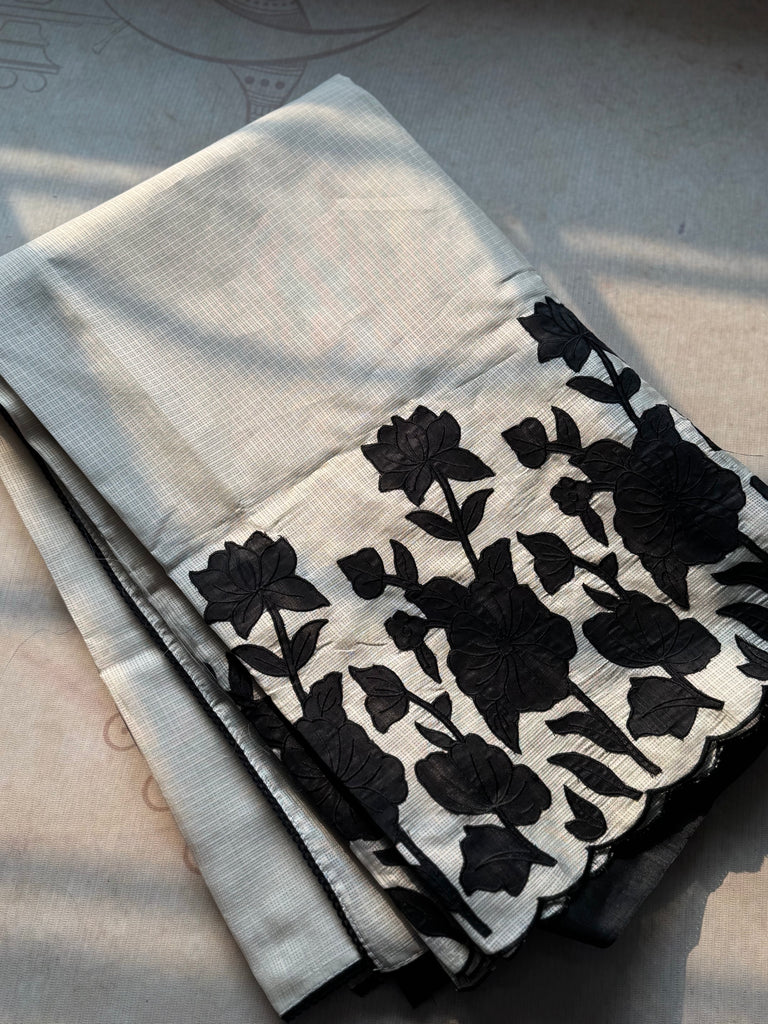 Ethereal and timeless — this Cotton Kota Appliqué Saree captures the beauty of handcrafted elegance. The saree comes in a serene white hue, delicately adorned with red-toned floral appliqué work that adds a bold yet graceful contrast. Each flower blooms beautifully along the border, finished with charming scalloped edges that lend a touch of finesse to its silhouette.