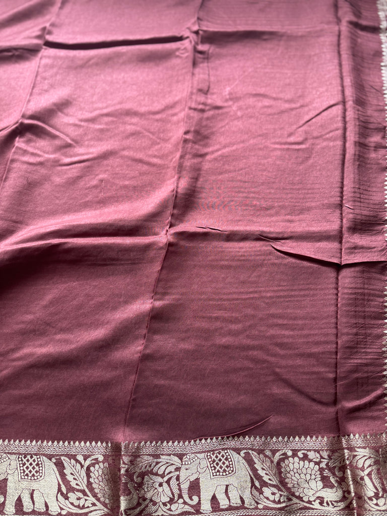 Grace meets sophistication in this exquisite plain brown Dola silk saree, designed to make a timeless statement. Crafted from premium Dola silk, the saree features a luxurious sheen and smooth drape that enhances its rich texture. The highlight of this piece is its intricately woven zari border, adorned with traditional motifs of floral patterns in shimmering zari threadwork.