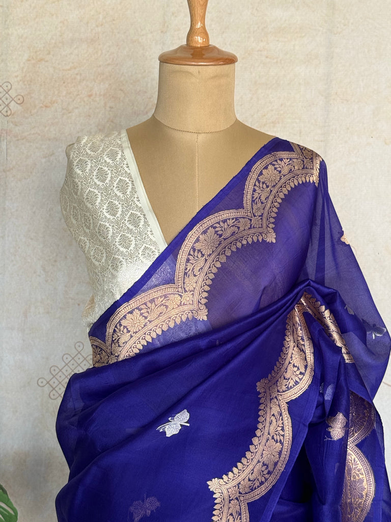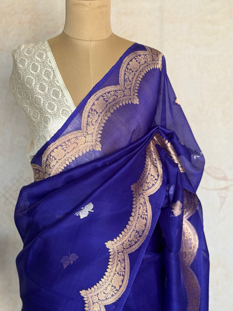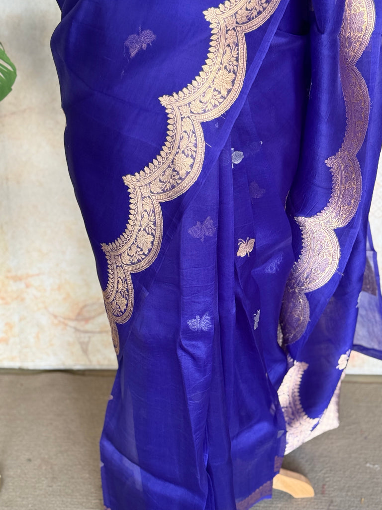 Embrace graceful charm with this rich royal pure organza saree, beautifully adorned with butterfly buttas in sona rupa zari that add a whimsical shimmer to the soft, pastel base. The saree features a rich gold zari border, perfectly complementing the delicate fabric while maintaining a light, weightless feel ideal for all-day elegance.
