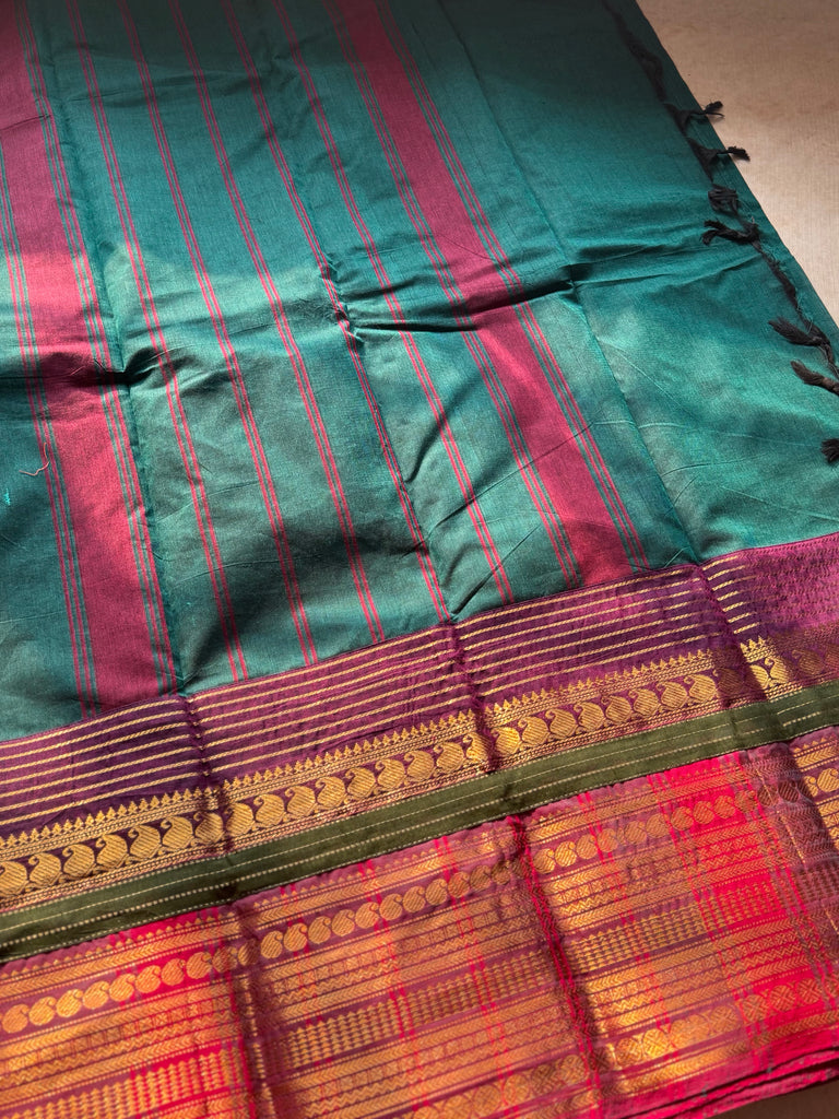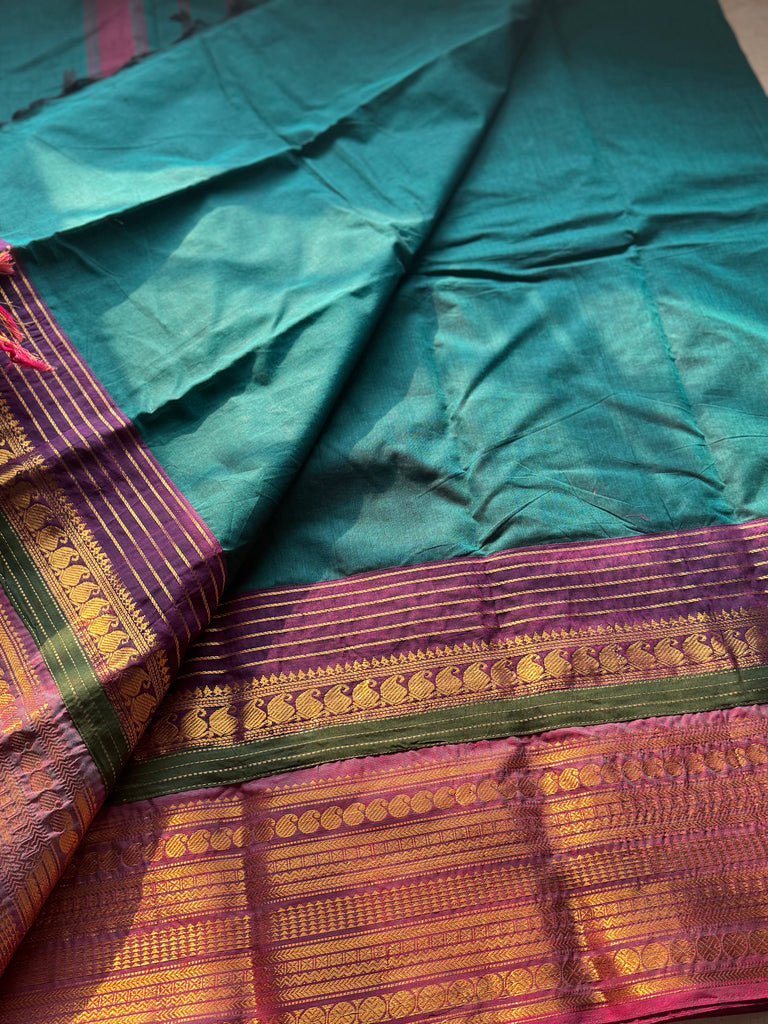 This peacock blue Kanchi Cotton saree, crafted by the skilled weavers of Tamil Nadu, showcases the rich beauty of traditional Chettinad weaving. It features an elegant zari-detailed border and pallu, adding a refined touch to its vibrant colour.