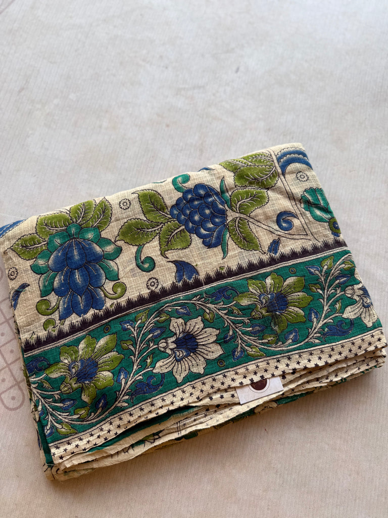 Grace meets tradition in this elegant Kota Cotton Kalamkari Saree, designed for effortless sophistication. Crafted from breathable and lightweight Kota cotton, this saree features an all-over floral vine pattern in soothing tones of blue, teal, and green on a soft off-white base.