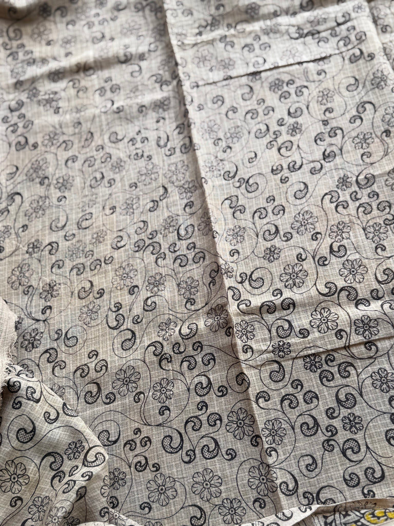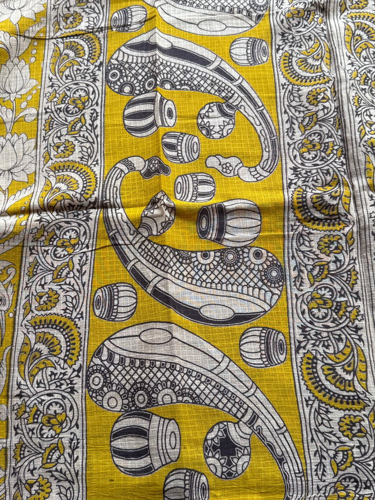 Step into effortless elegance with this stunning Kota Cotton Kalamkari Saree, beautifully crafted in a rich mustard yellow base. The saree features intricate all-over floral Kalamkari-inspired motifs in soft ivory and grey tones, creating a striking yet balanced contrast that reflects timeless artistry.