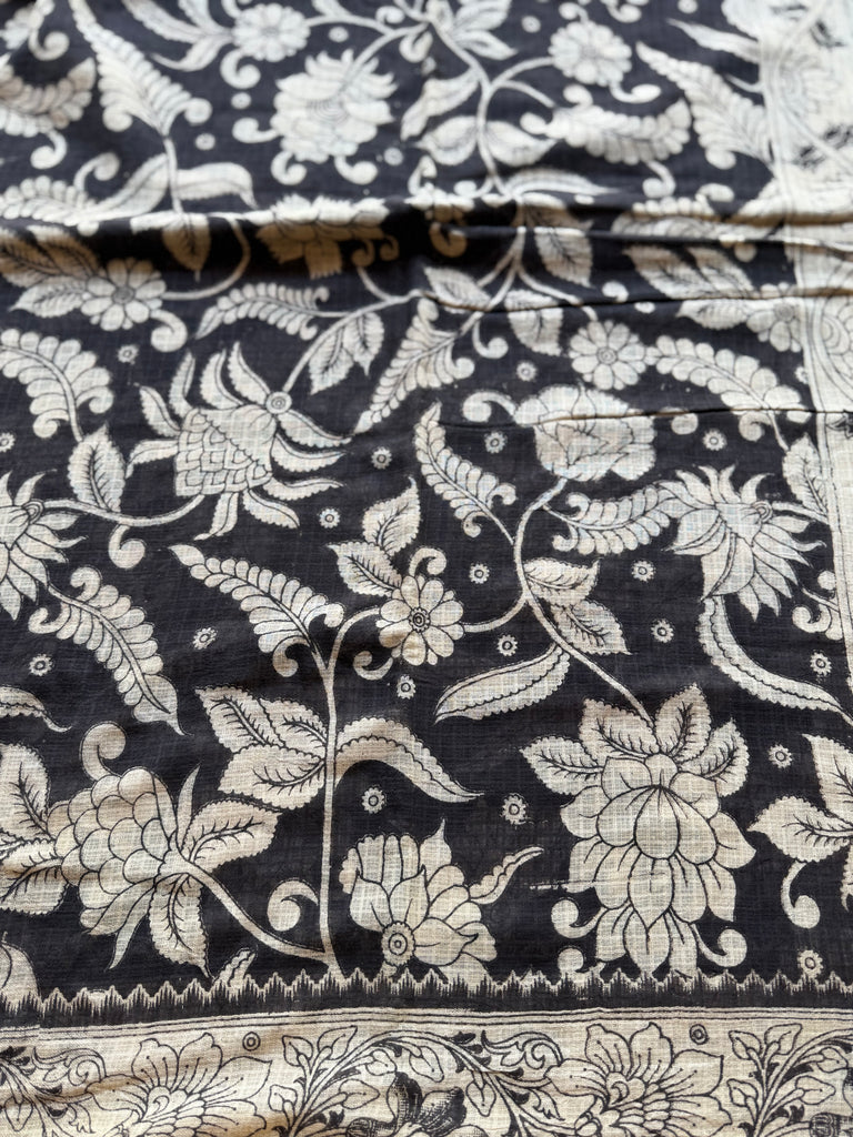 Elevate your ethnic wardrobe with this elegant Kota Cotton Kalamkari Saree, designed to blend tradition with artistic charm. Crafted in a sophisticated black and off-white color palette, this saree features intricate floral and vine Kalamkari-inspired motifs spread across the body, creating a timeless and graceful look.