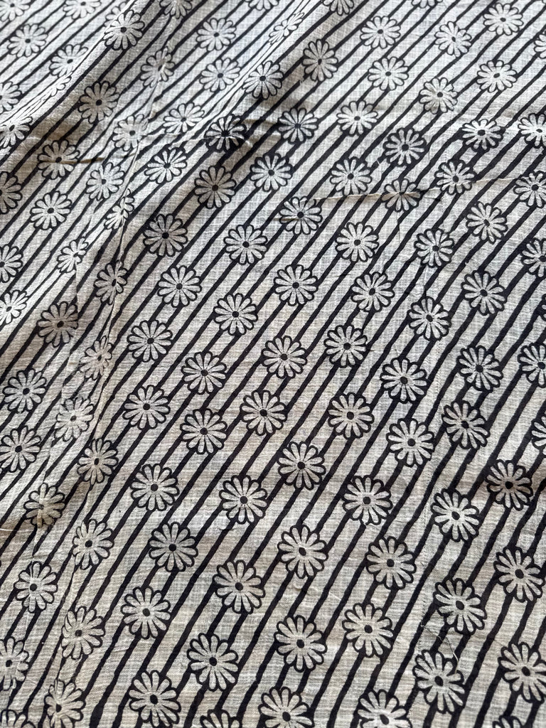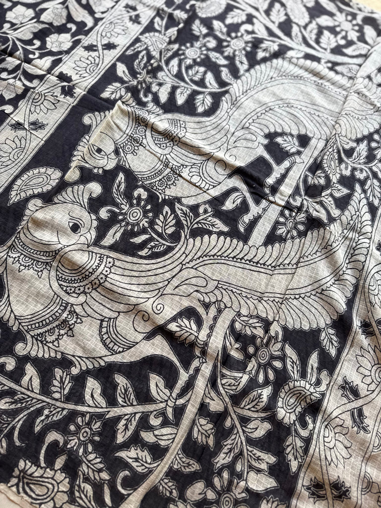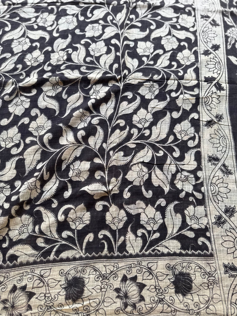 Elevate your ethnic wardrobe with this elegant Kota Cotton Kalamkari Saree, crafted in a timeless black and off-white palette. The saree features intricate hand-inspired Kalamkari floral vine motifs spread gracefully across the body, giving it a rich traditional appeal. The border is beautifully designed with detailed floral patterns, adding structure and sophistication to the drape.
