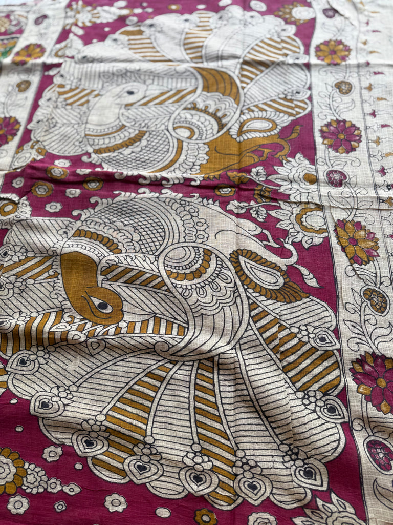 This elegant Kota cotton saree showcases the timeless beauty of Kalamkari-inspired artistry with a contemporary twist. The body features intricate hand-drawn style motifs, including graceful deer set amidst leafy vines on a rich mustard-yellow base, creating a striking contrast with the deep magenta accents.