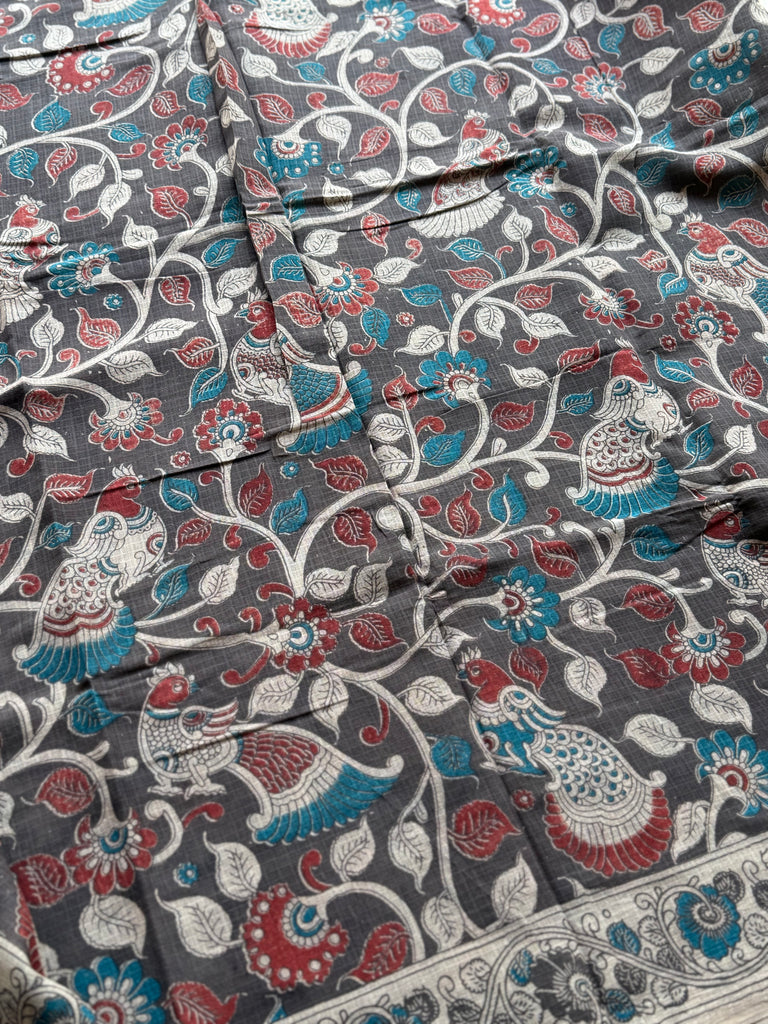This elegant Kota cotton saree showcases a rich blend of traditional Kalamkari artistry and contemporary charm. Set against a deep charcoal grey base, the saree is adorned with intricate floral vines, stylized birds, and storytelling motifs in hues of teal blue, rust red, and ivory. The highlight is its beautifully illustrated Raja Rani printed pallu, adding a regal narrative touch to the drape.