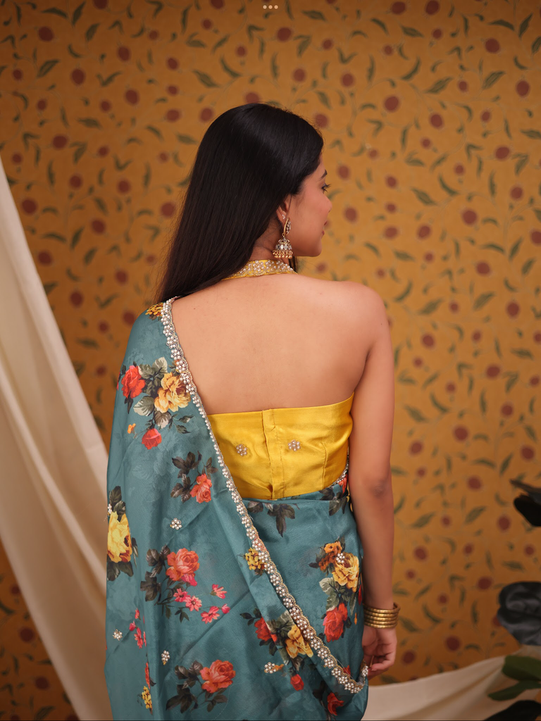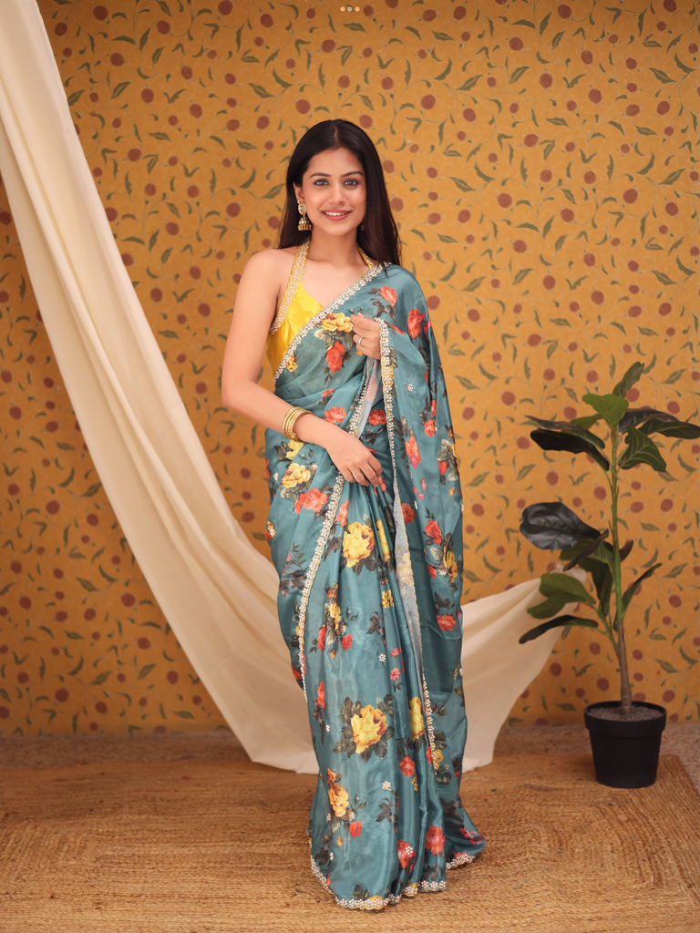 This exquisite boutique saree is crafted in luxurious Deep Teal Green Malai grape silk, adorned with delicate floral prints that add a timeless charm. The rich texture of the fabric enhances its graceful drape, making it a perfect choice for special occasions.
