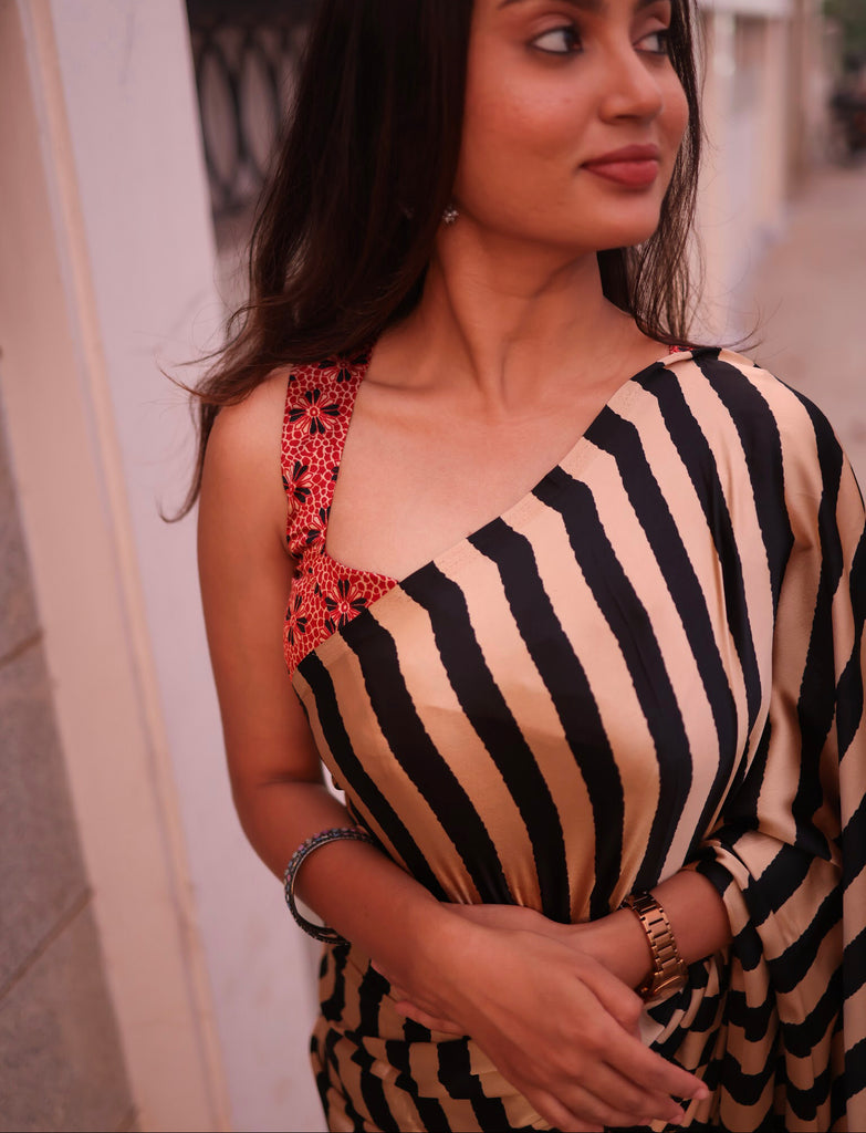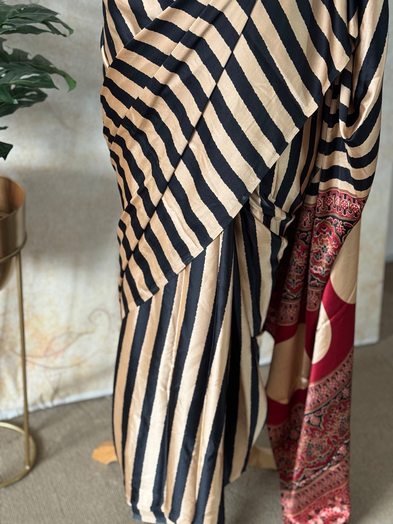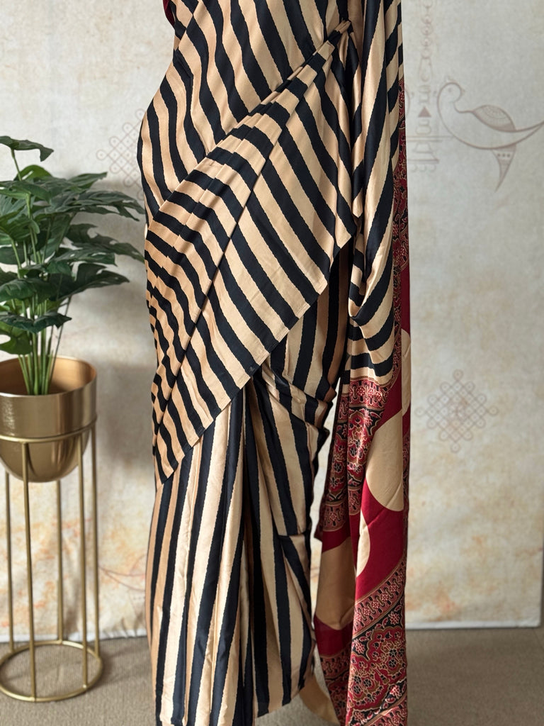 Rooted in India’s rich textile heritage, this Black & Beige Modal Saree with Striped Body and Ajrakh Printed Blouse is a refined expression of handcrafted elegance. Woven in soft, breathable modal fabric, the saree features a calm striped body in beige, offering a minimalist base that highlights the beauty of traditional design.