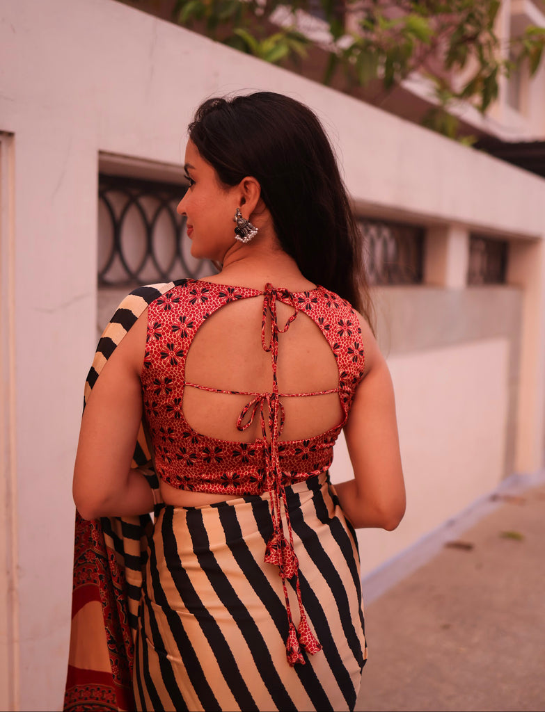 The look is elevated with a running blouse adorned in authentic Red shade Ajrakh print, showcasing deep red hues and intricate geometric motifs inspired by centuries-old printing traditions from Kutch and Rajasthan. Together, the contemporary stripes and heritage Ajrakh create a balanced aesthetic—subtle yet striking.