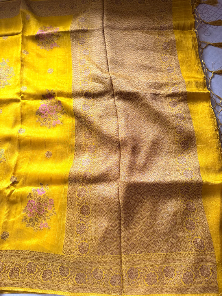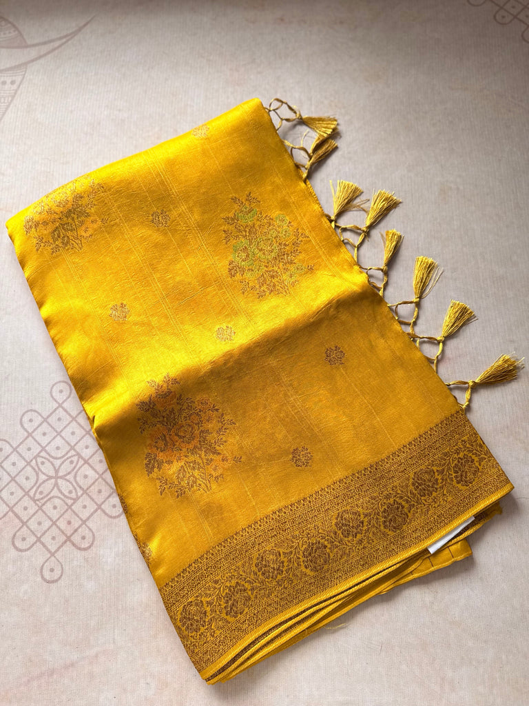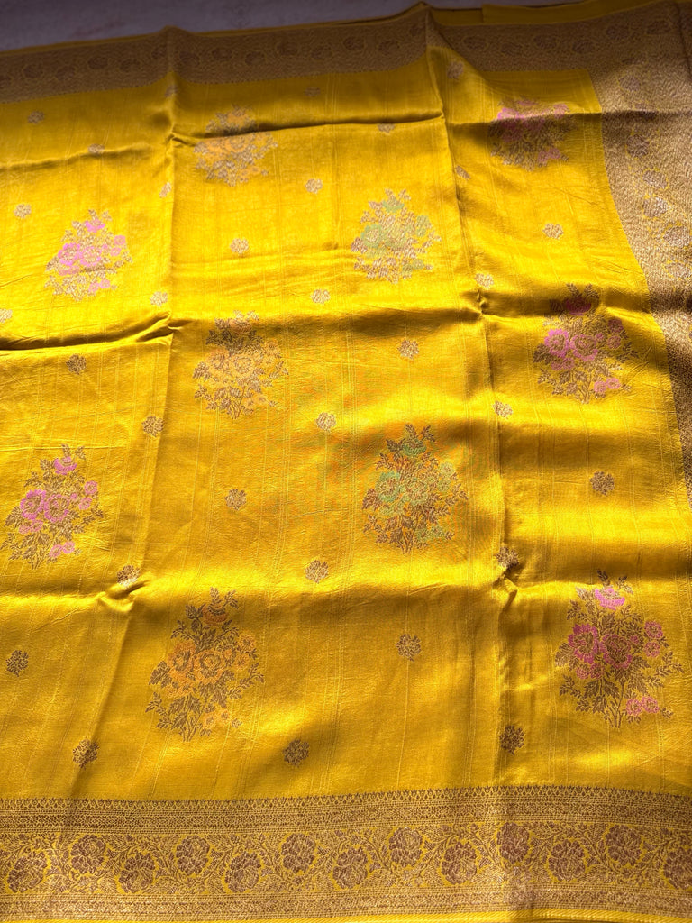 Woven in a soothing Mustard tone, the saree features delicate floral buttas scattered across the body, each intricately crafted with meenakari accents in soft yellow, pink, and green tones. These multi-tone motifs add a lovely play of color without overpowering the elegant base.