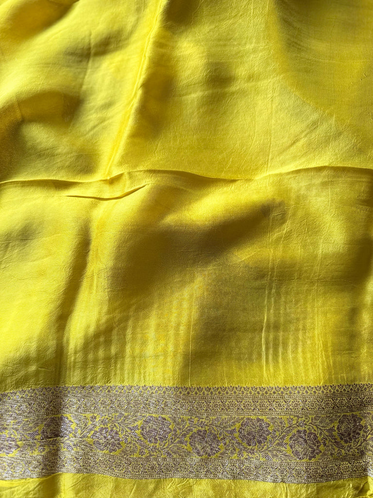 The zari-woven border stands out with its finely detailed traditional Banarasi patterns, giving the saree a regal frame. The pallu continues this antique zari work, showcasing ornate patterns that elevate the overall richness.