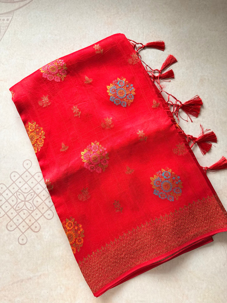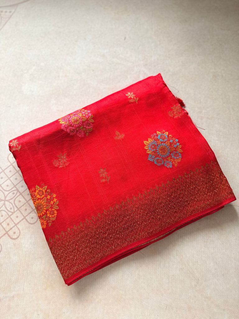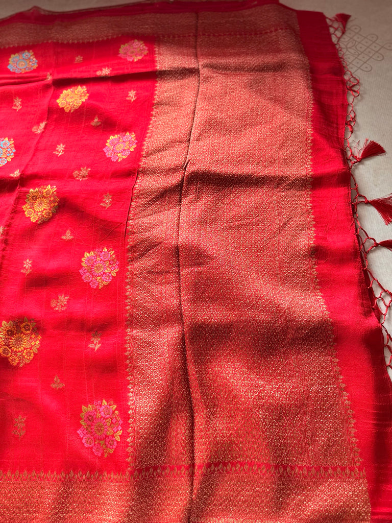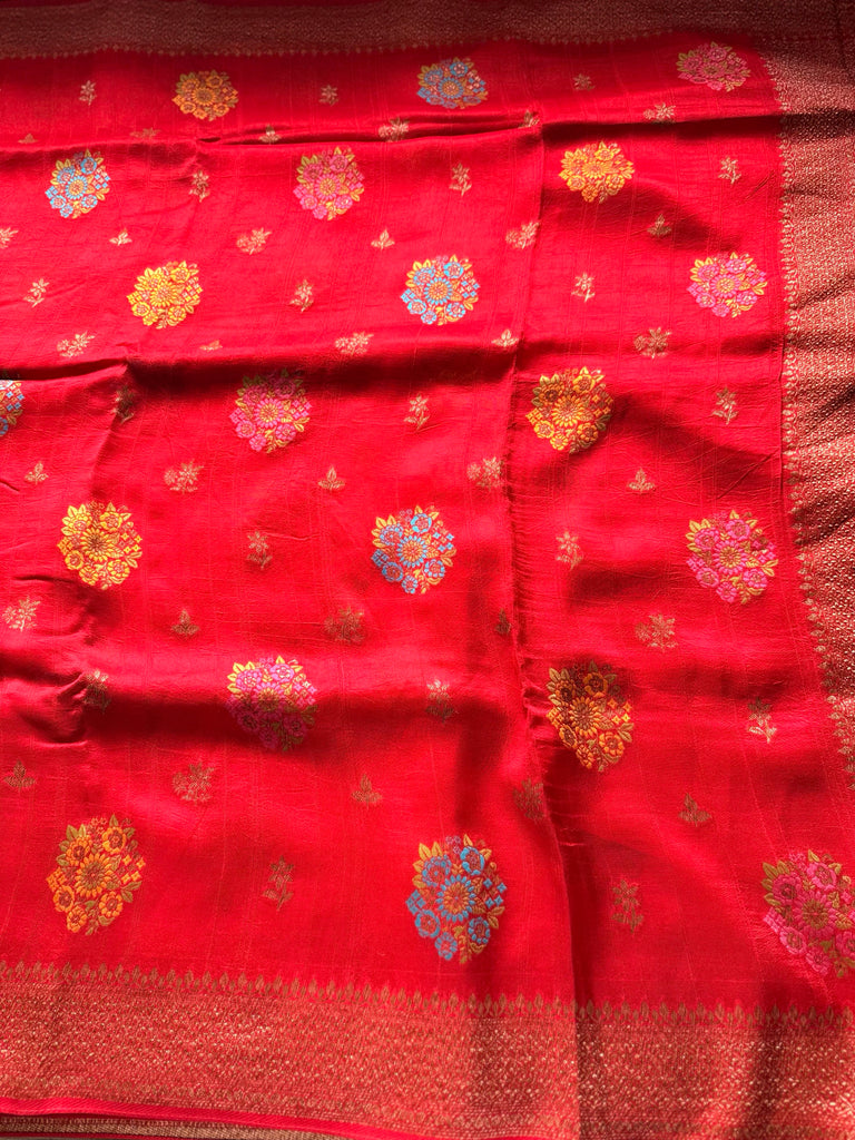 Woven in a soothing Red tone, the saree features delicate floral buttas scattered across the body, each intricately crafted with meenakari accents in multi coloured tones. These multi-tone motifs add a lovely play of color without overpowering the elegant base.