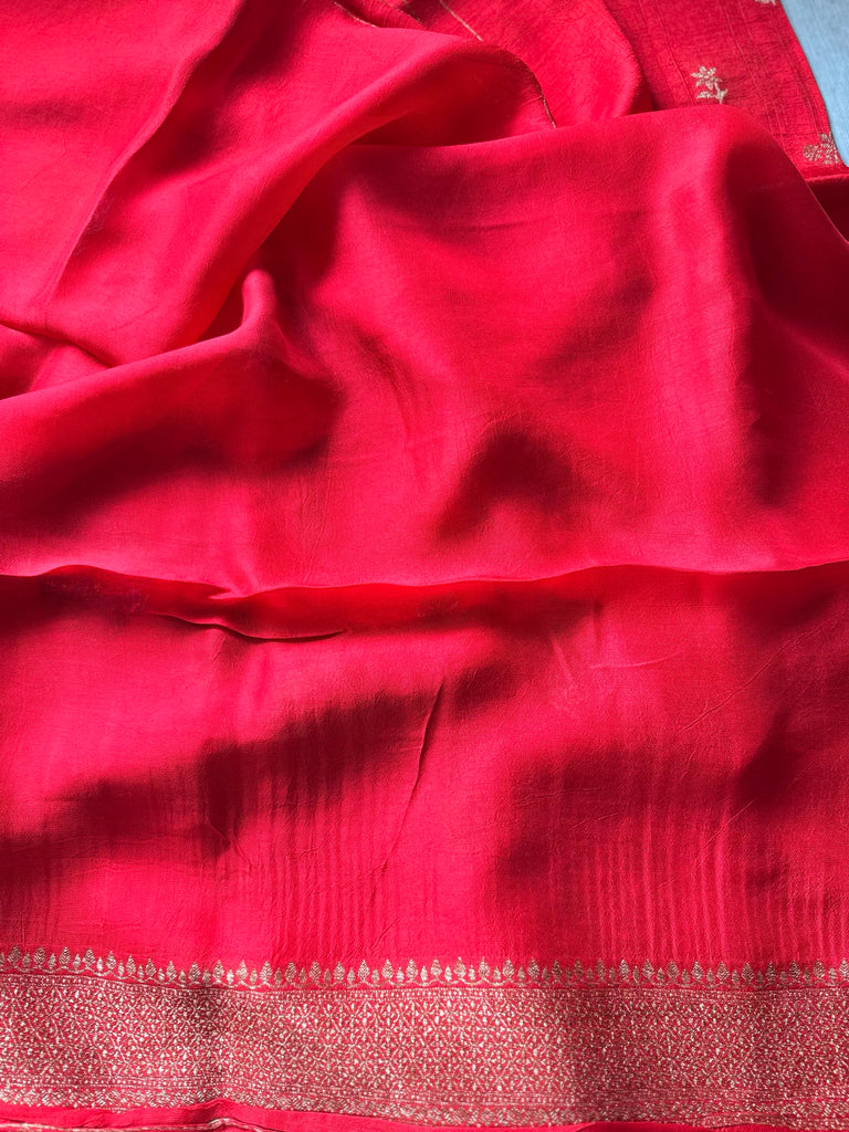 The zari-woven border stands out with its finely detailed traditional Banarasi patterns, giving the saree a regal frame. The pallu continues this antique zari work, showcasing ornate patterns that elevate the overall richness.