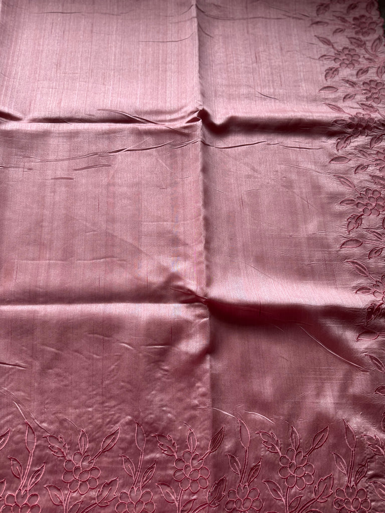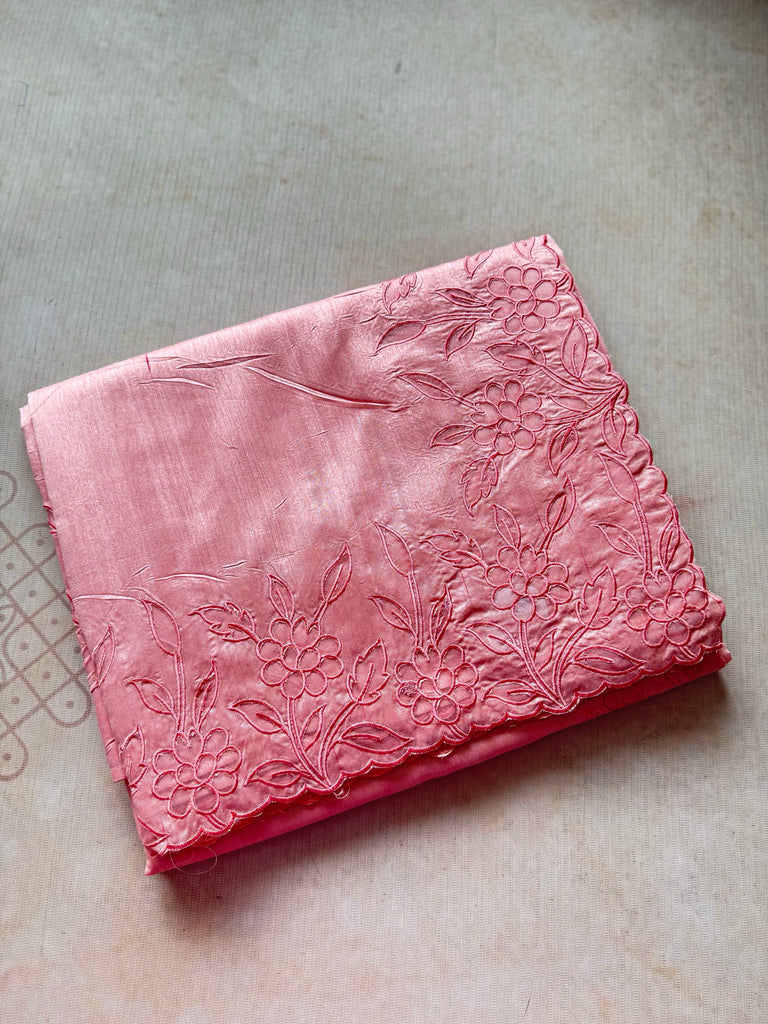 The highlight of the saree lies in its intricately crafted cutwork pallu and border, designed with flowing vine and leaf motifs that bring a unique blend of tradition and artistry. The detailed craftsmanship lends a timeless sophistication, effortlessly transforming your look into one of quiet luxury and grace. Pair it with minimal jewelry to let the fabric and work speak for themselves.