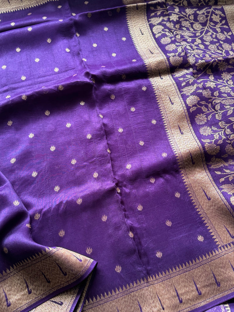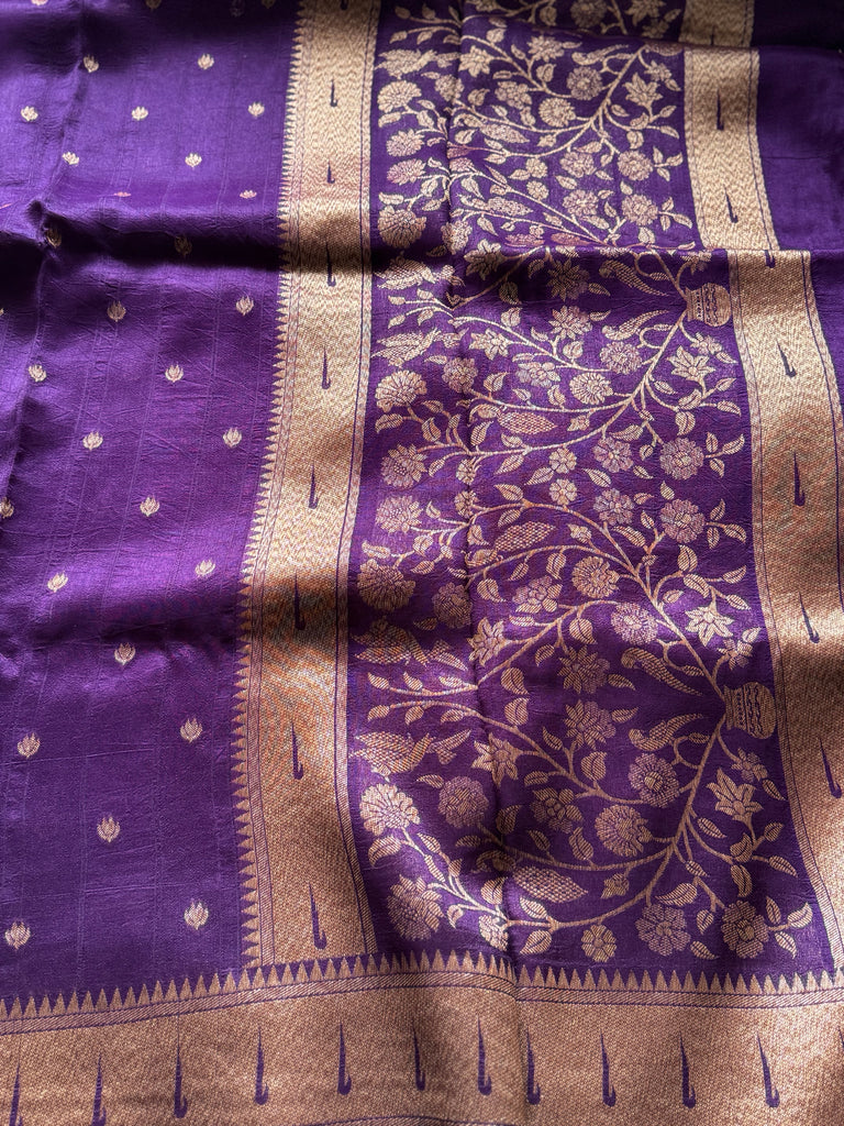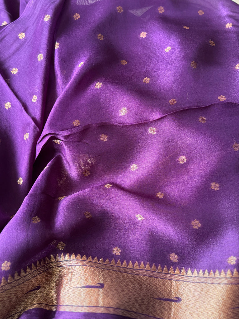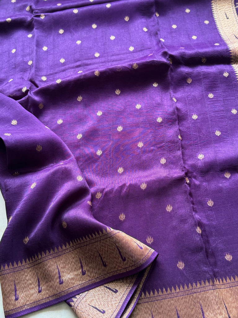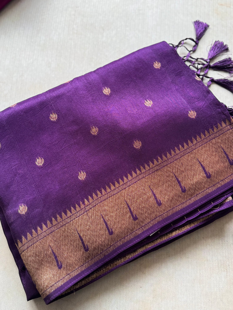 This beautiful Violet Antique Banarasi saree, crafted from premium dupion silk, showcases elegant golden zari lotus buttas intricately woven across the body. The saree features a stunning traditional temple border highlighted with classic Paithani-style zari designs, adding a rich cultural touch to its overall appeal.